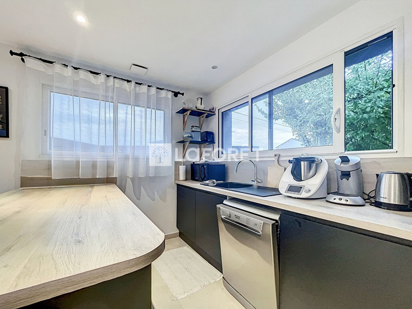 - Au rez-de-chaussée : une entrée, un séjour, une salle à manger, une cuisine aménagée et équipée, une chambre et une salle de douche avec WC. Un jardin est accessible depuis le séjour.