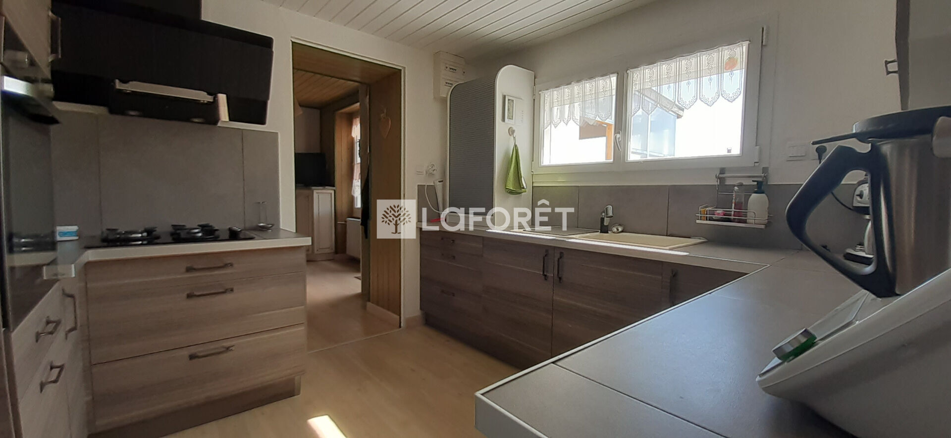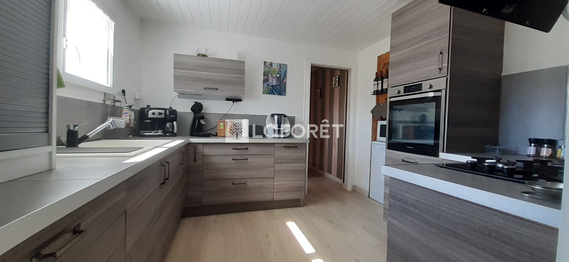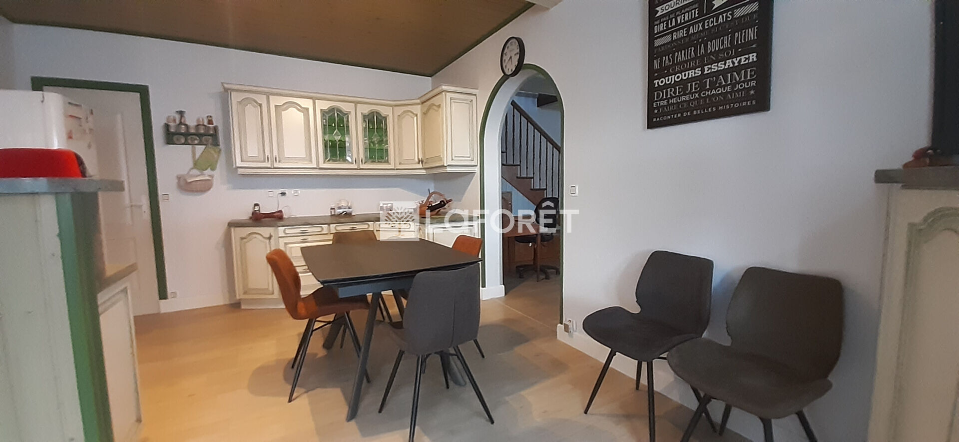 Cuisine spacieuse, salle à manger, salon cheminée