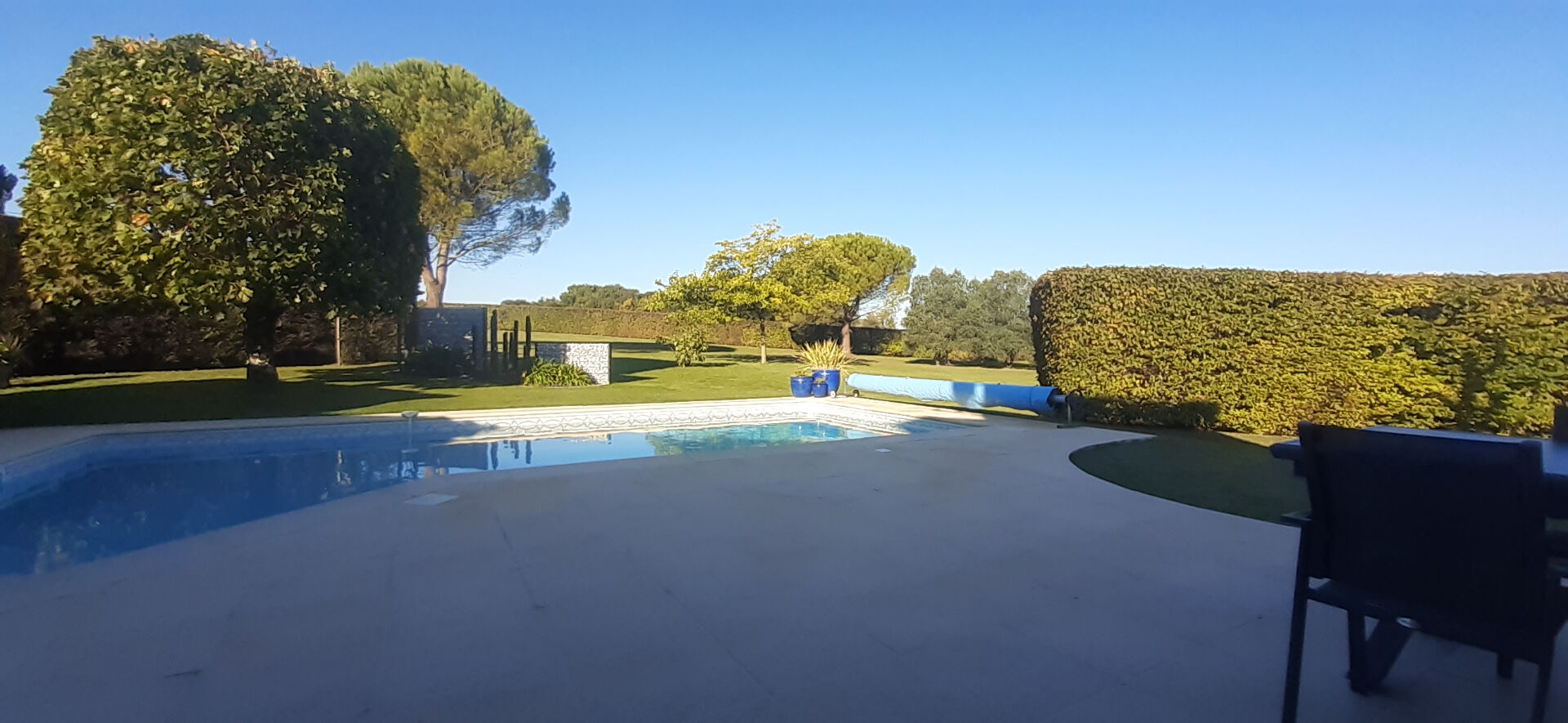 À l'extérieur, la maison s'ouvre sur une agréable terrasse donnant sur une piscine parfaitement intégrée dans un superbe terrain gazonné de plus de 4 000 m², offrant intimité et détente.