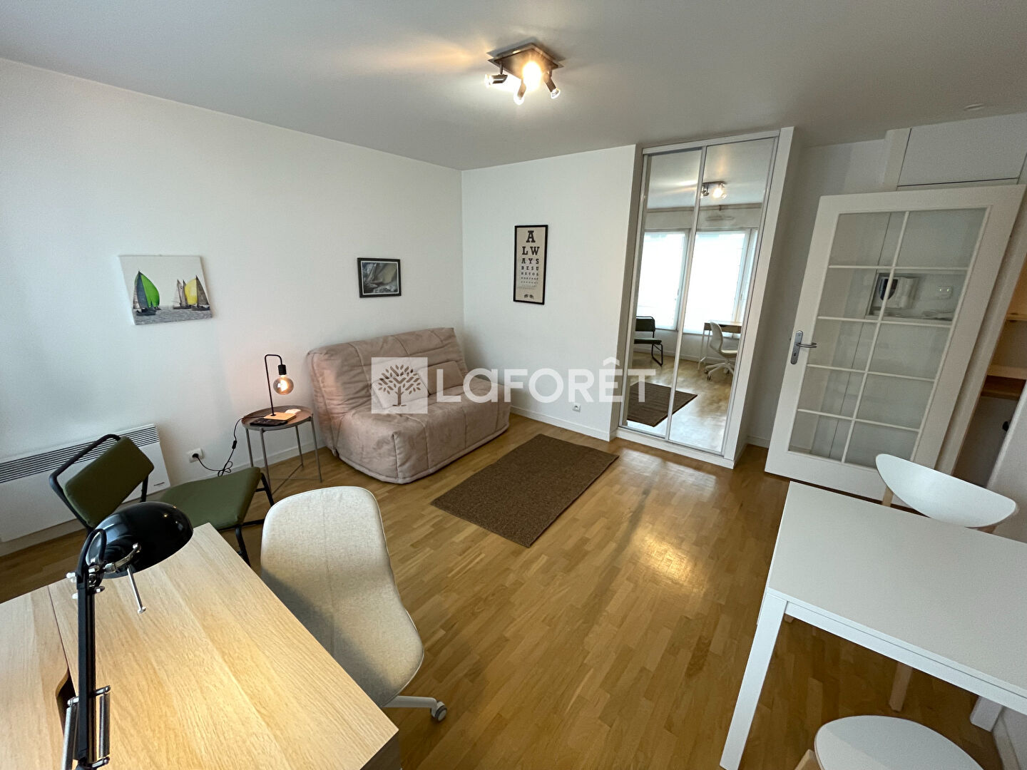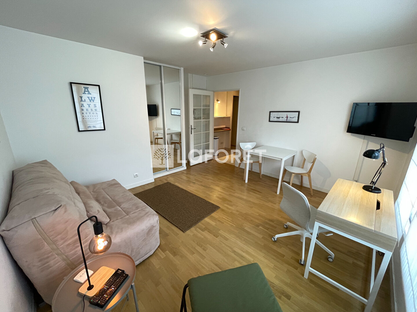 Appartement T1 MEUBLé en parfait état comprenant cuisine aménagée et entièrement équipée (four, micro-ondes, plaques, hotte, frigo), séjour, salle d'eau avec wc et lave-linge.