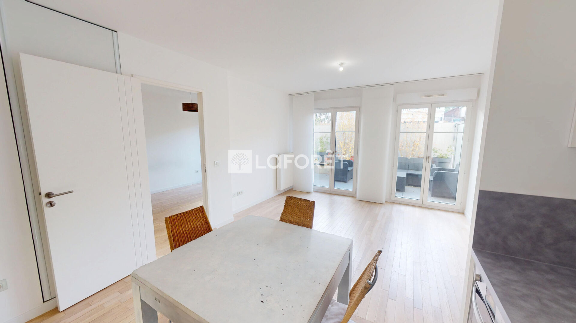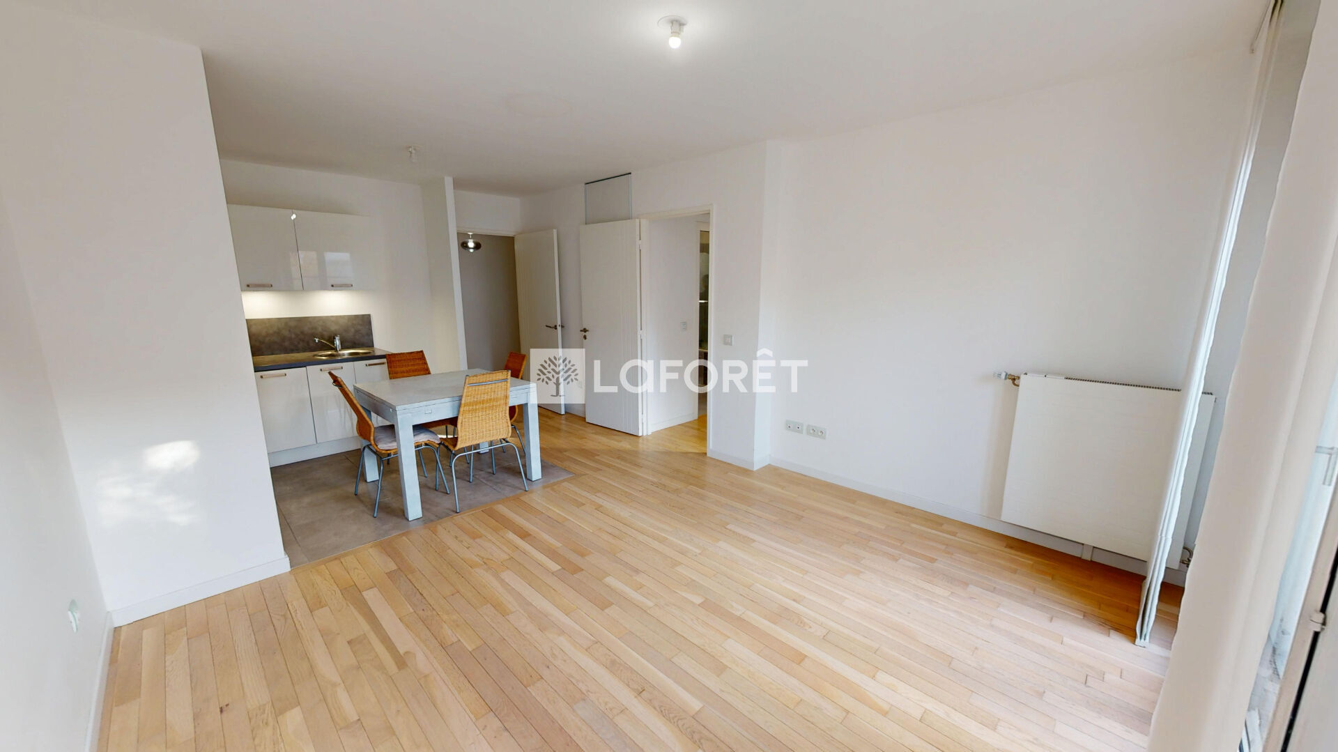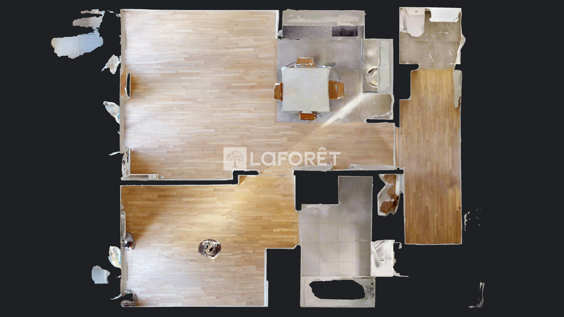 Entrée avec placard, séjour avec cuisine ouverte aménagée et équipée, chambre avec placard, salle de bains, wc séparés avec emplacement lave-linge.