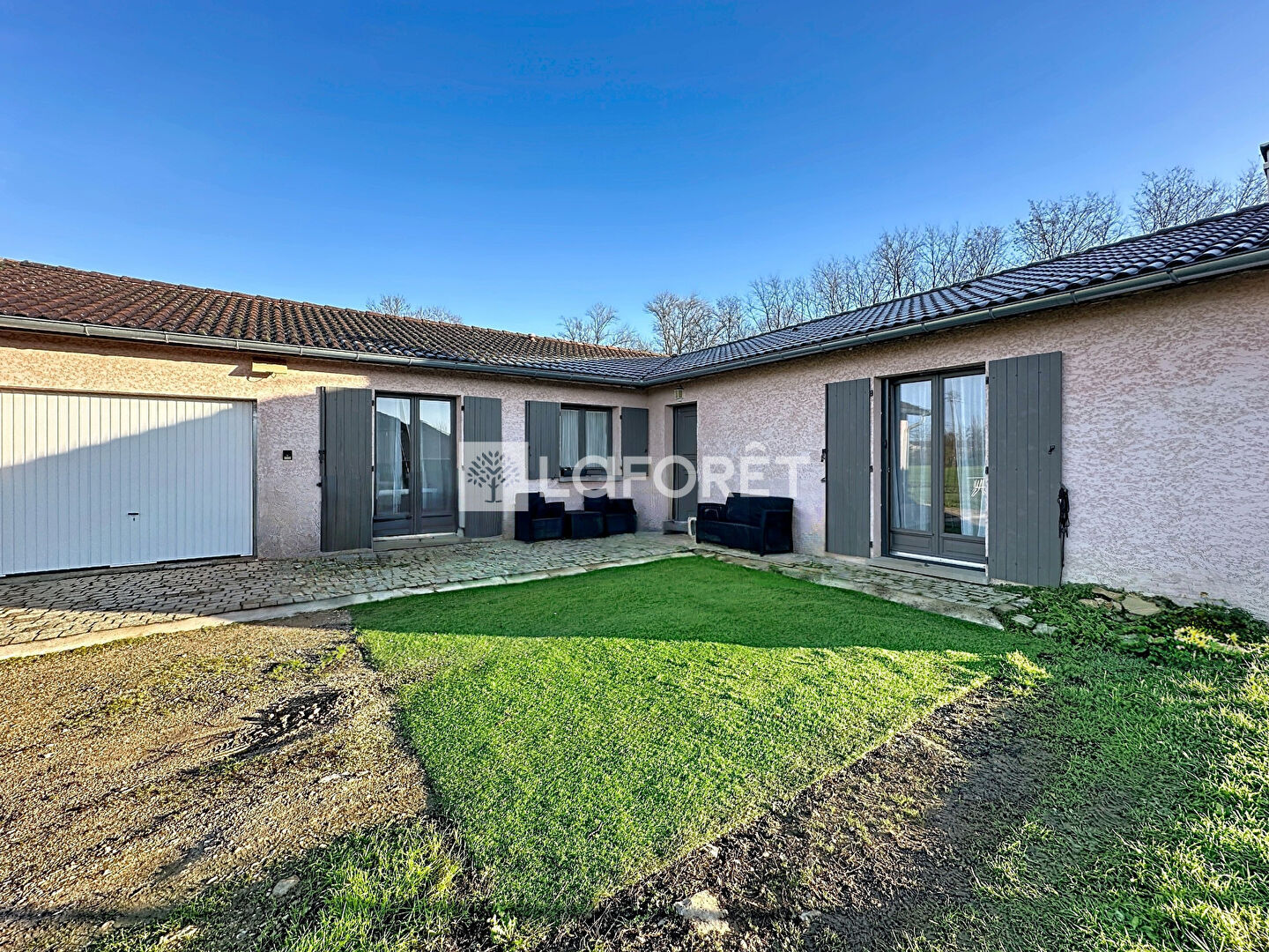 À l'extérieur, vous profiterez d'un terrain en partie clos d'environ 1 418 m², équipé d'un portail motorisé, ainsi qu'un garage avec porte manuelle neuve.