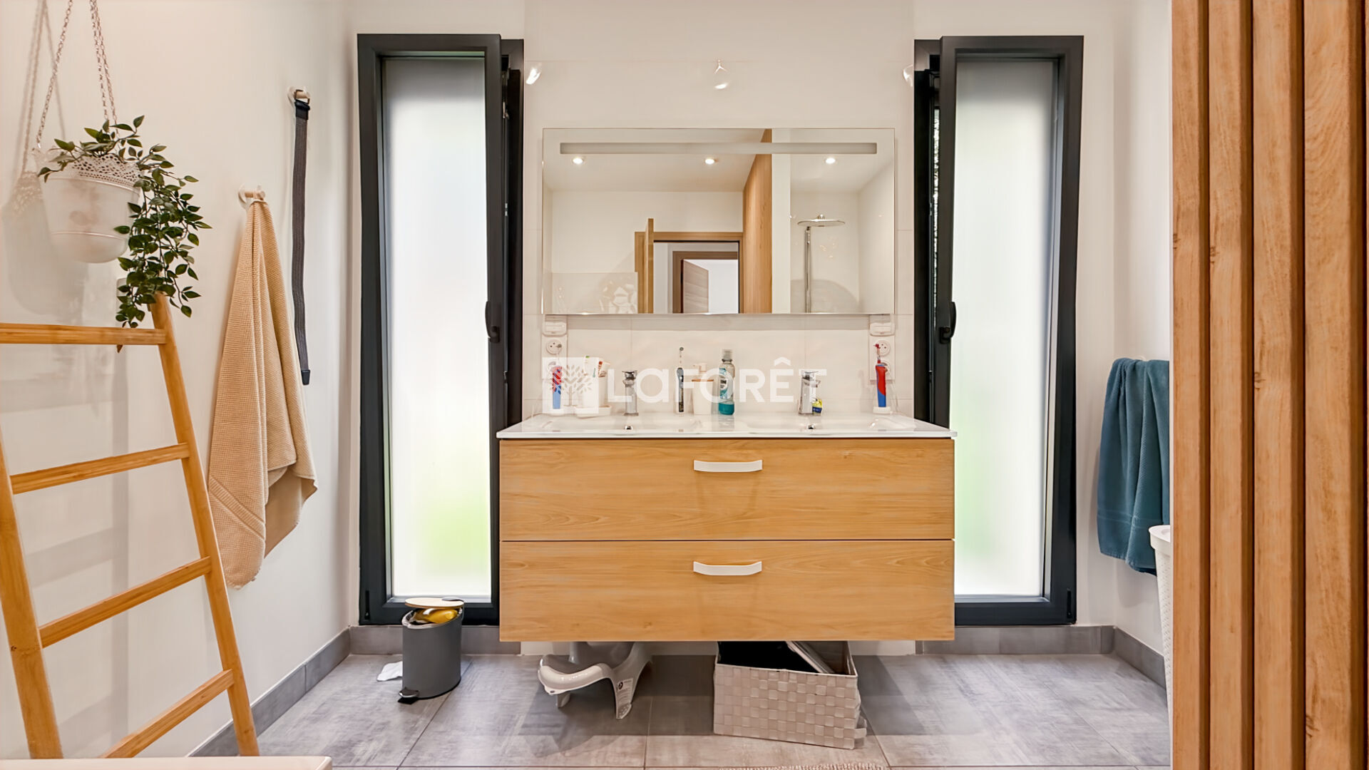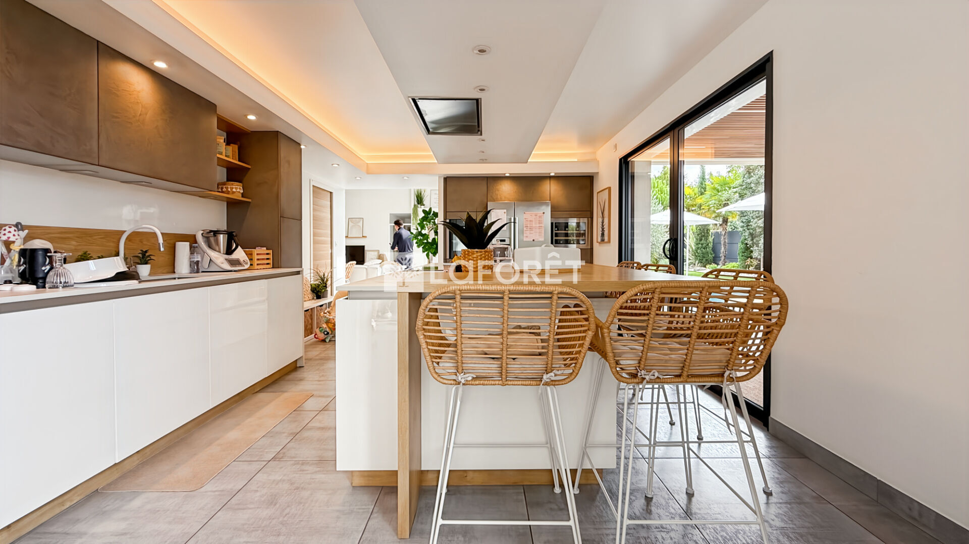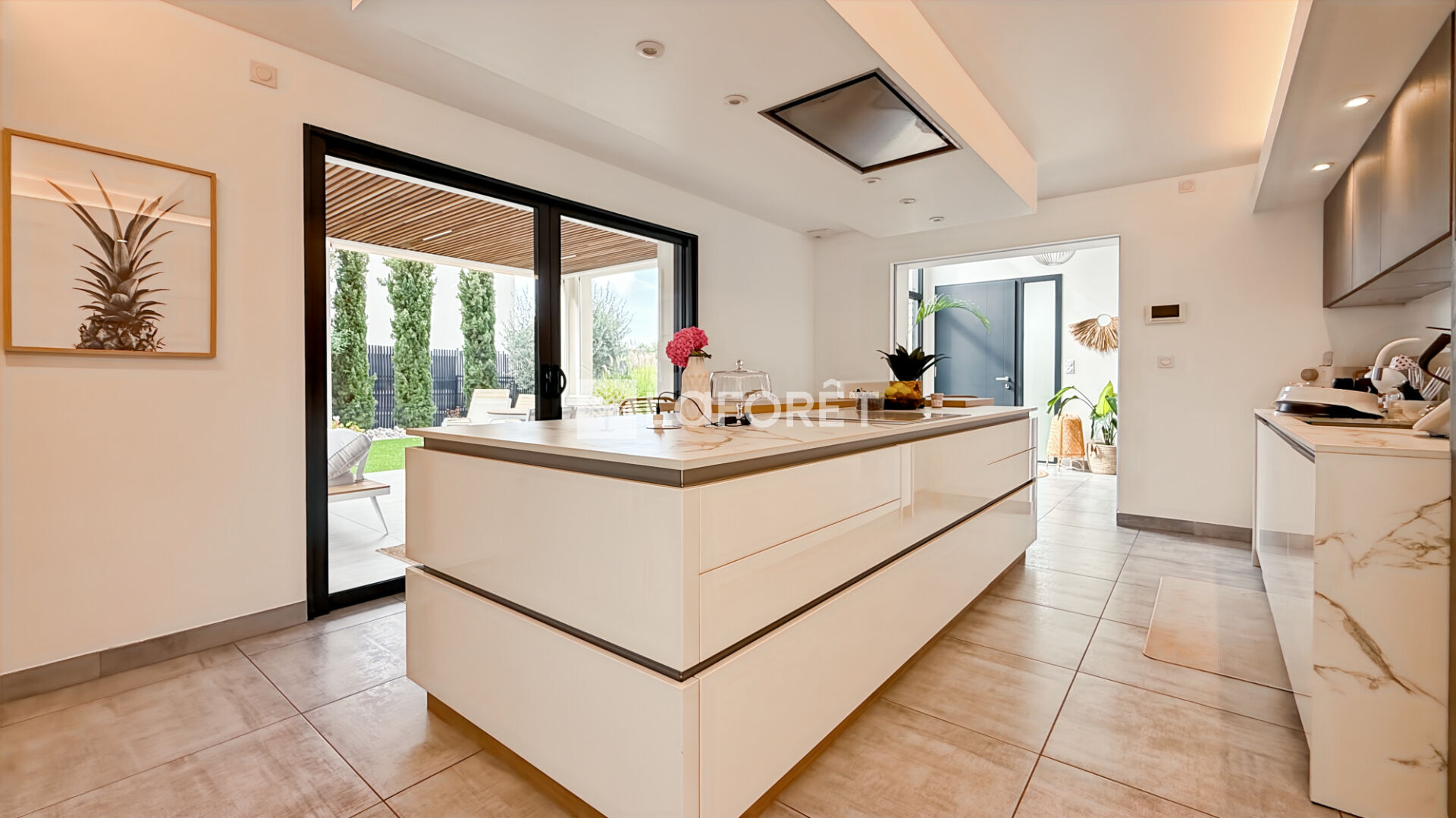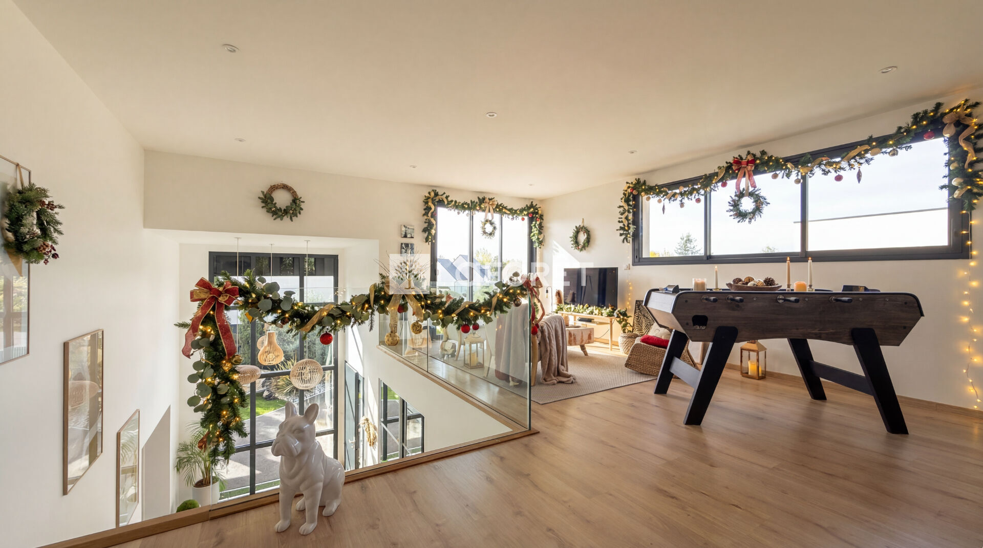 de plain-pied : un hall d'entrée "cathédrale" (avec rangement), une suite parentale (chambre, salle d'eau, WC, dressing), une salle de sports, une cuisine équipée et aménagée ouverte sur la pièce à vivre traversante de près de 50m2; une chambre d'amis ouverte sur la terrasse (avec salle d'eau et grand placard), le hall de nuit dessert un bureau, 3 belles chambres, un dressing partagé, une salle de bains/salle d'eau, un WC indépendant.