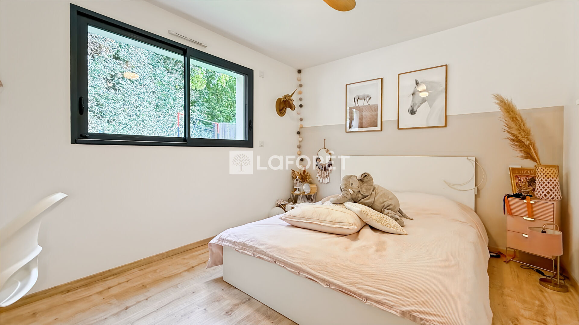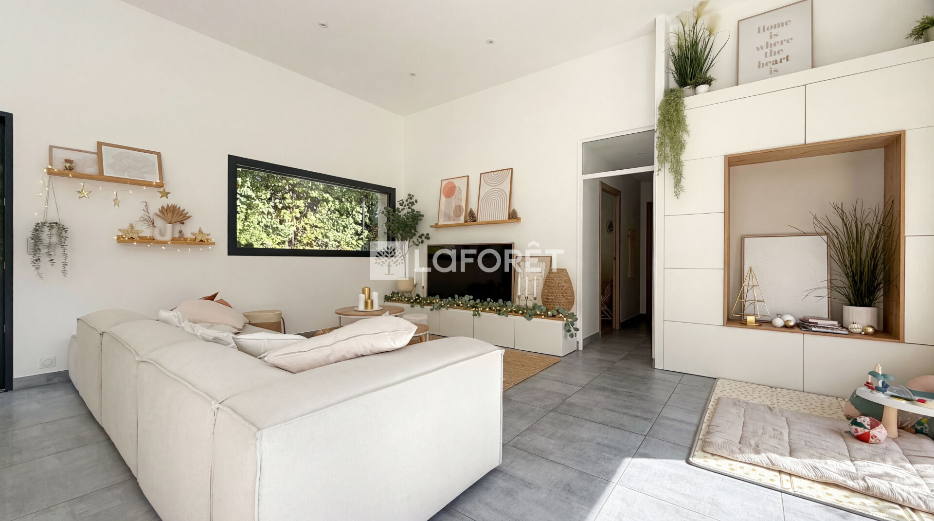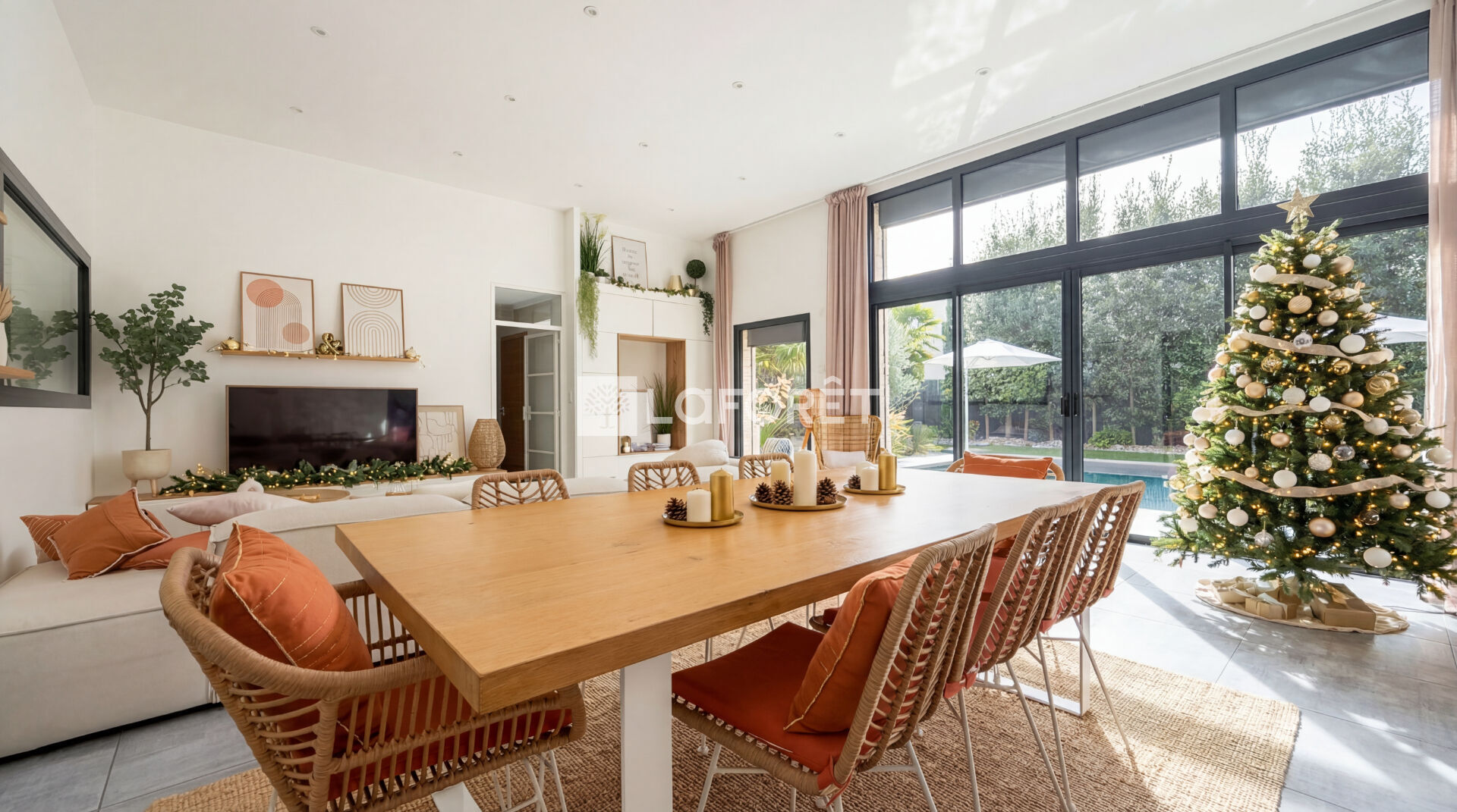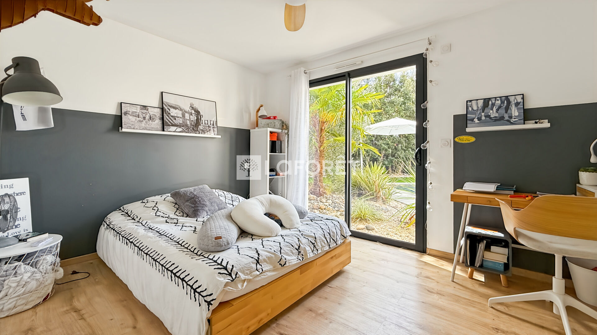 de plain-pied : un hall d'entrée "cathédrale" (avec rangement), une suite parentale (chambre, salle d'eau, WC, dressing), une salle de sports, une cuisine équipée et aménagée ouverte sur la pièce à vivre traversante de près de 50m2; une chambre d'amis ouverte sur la terrasse (avec salle d'eau et grand placard), le hall de nuit dessert un bureau, 3 belles chambres, un dressing partagé, une salle de bains/salle d'eau, un WC indépendant.