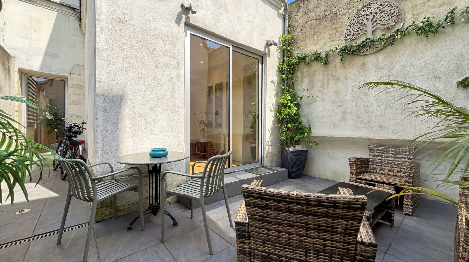 La grande cuisine ouverte, véritable pièce de vie, s'ouvre sur une jolie cour intérieure, intime et agréable, parfaite pour profiter de l'extérieur en plein centre-ville.
