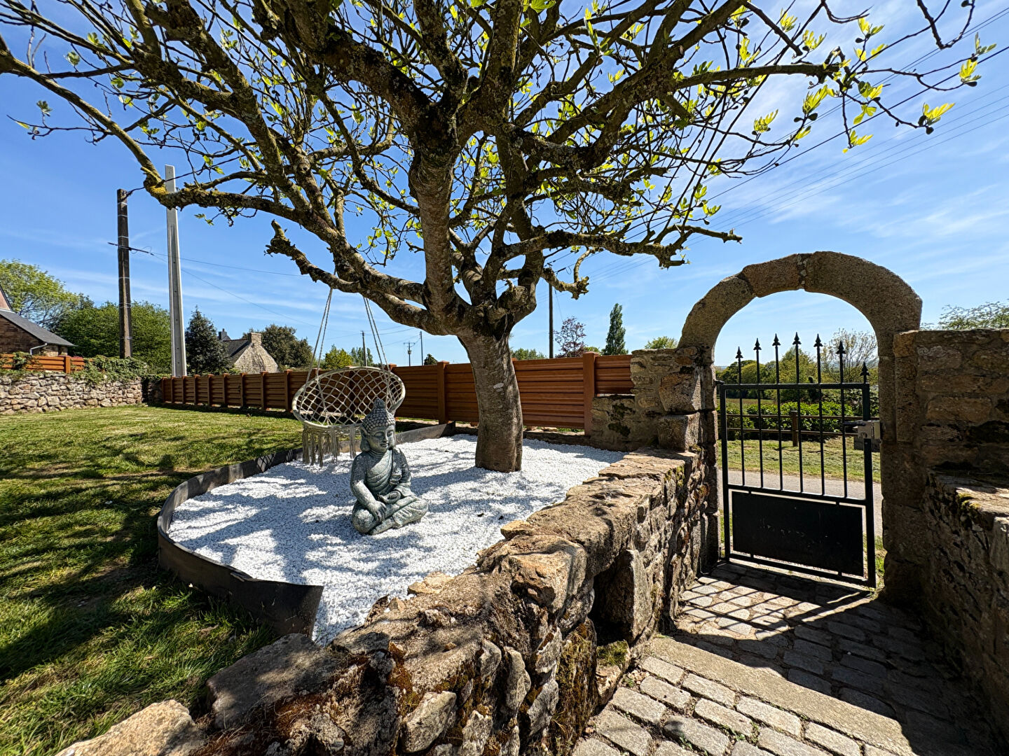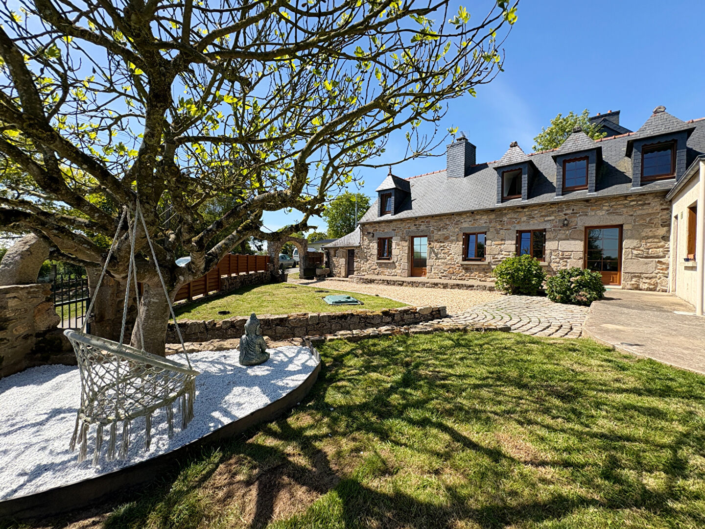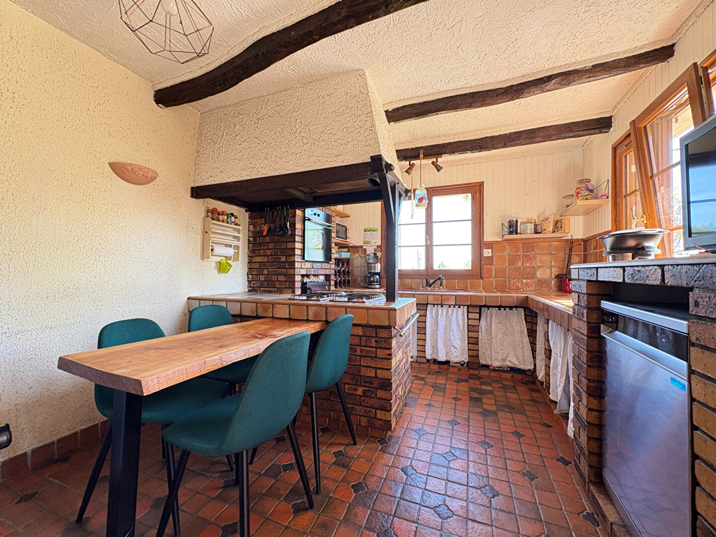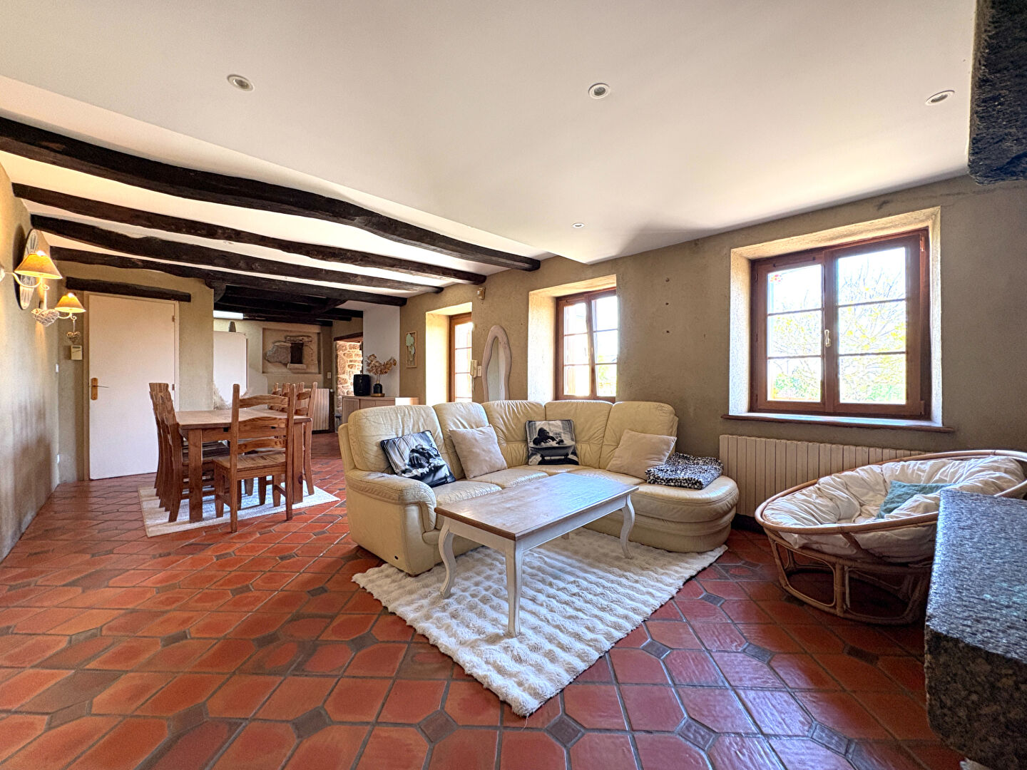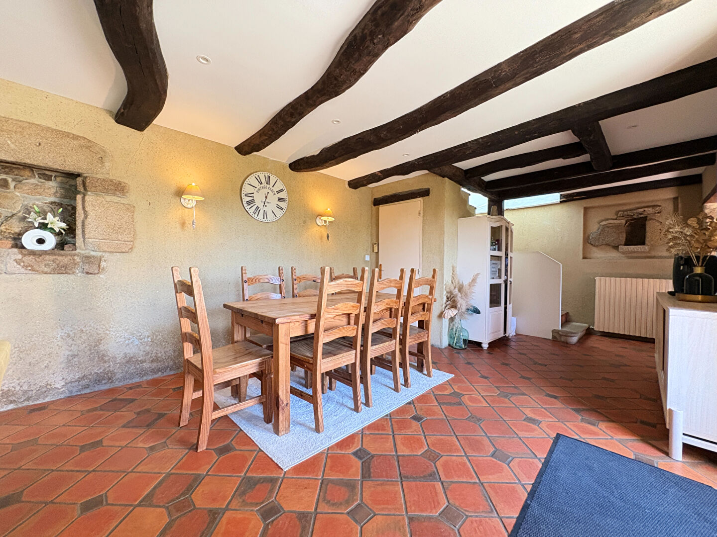 Implantée sur un terrain d'environ 636 m², cette maison allie le cachet de l'ancien avec des matériaux authentiques tels que les tomettes au sol, les poutres apparentes et les éléments en granit.