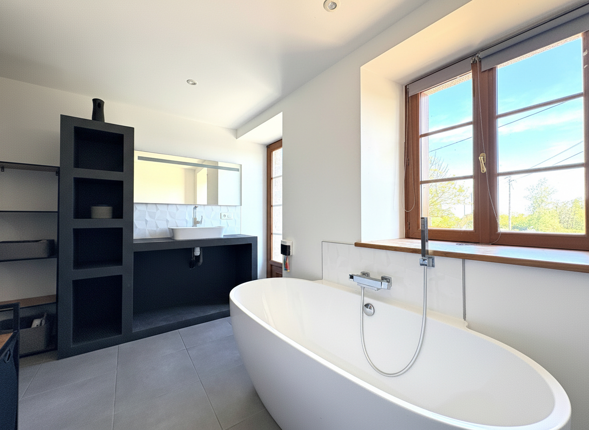 Ce niveau comprend également une salle de bains avec baignoire et douche, un WC, ainsi qu'une buanderie et un espace de stockage.