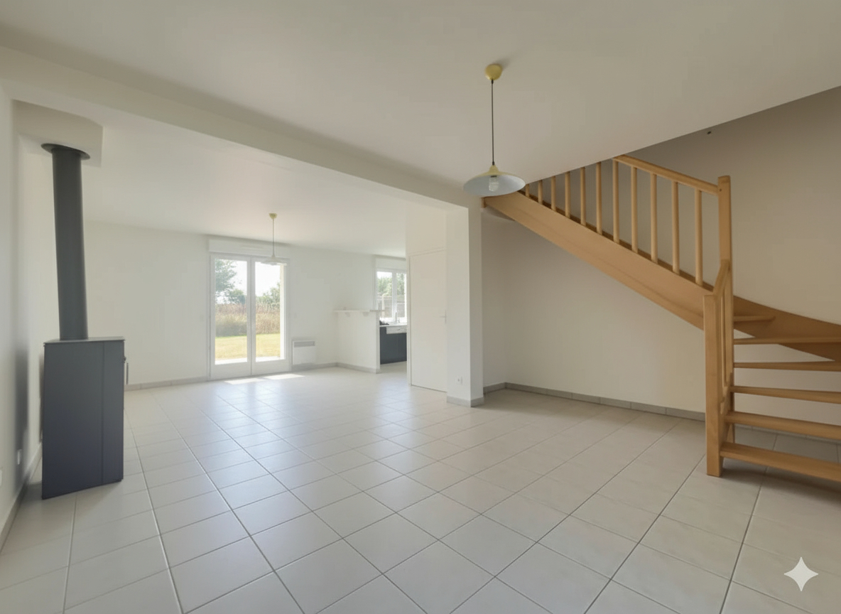 À l'étage, trois chambres confortables et une spacieuse salle d'eau avec toilettes intégrés offrent un espace intime et pratique pour toute la famille.