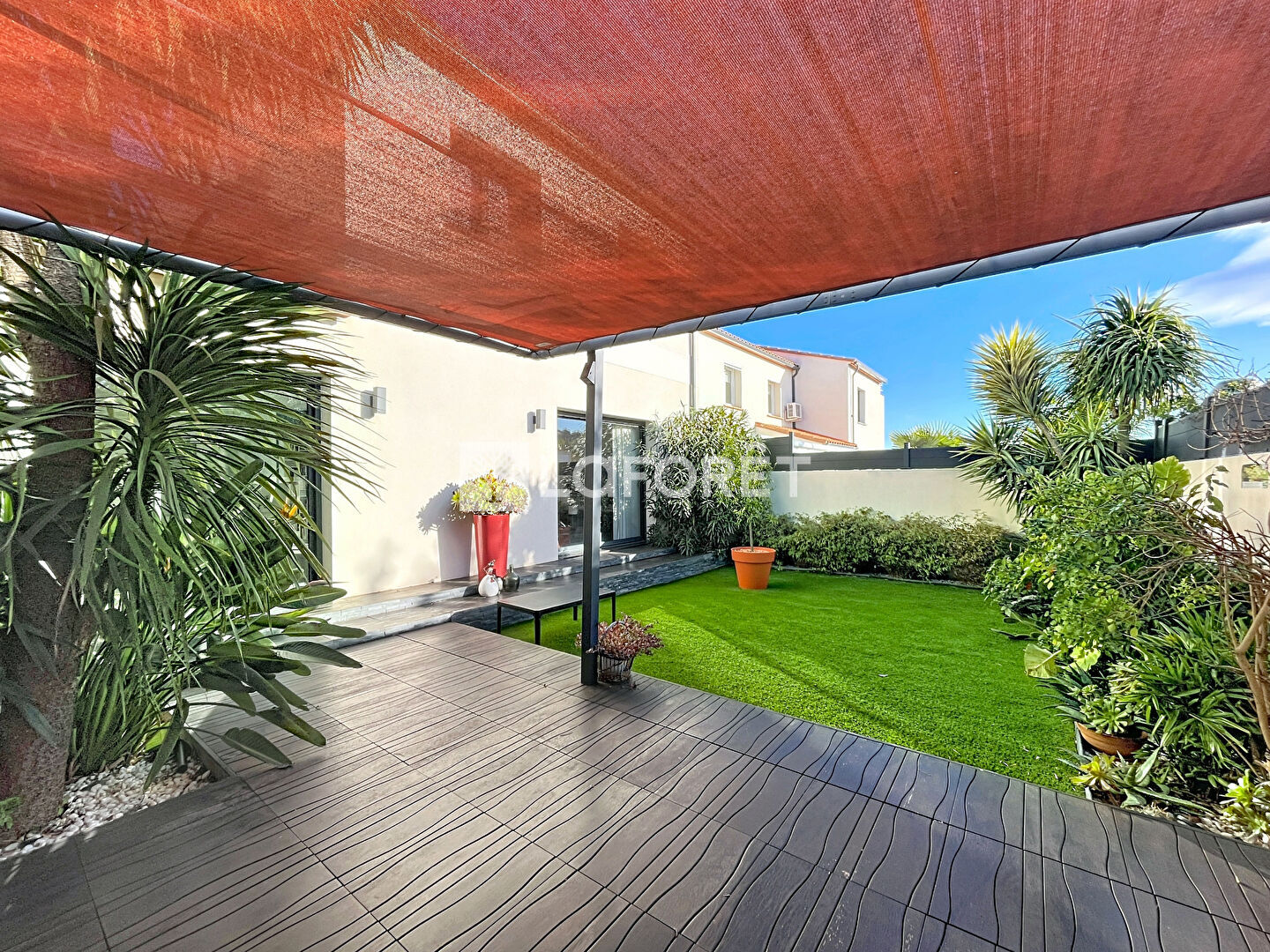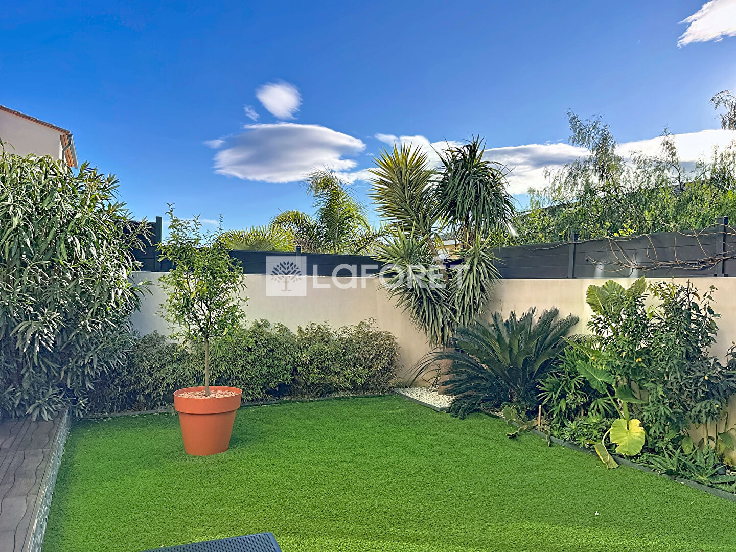 Joli jardin arboré et agrémenté d'une terrasse.