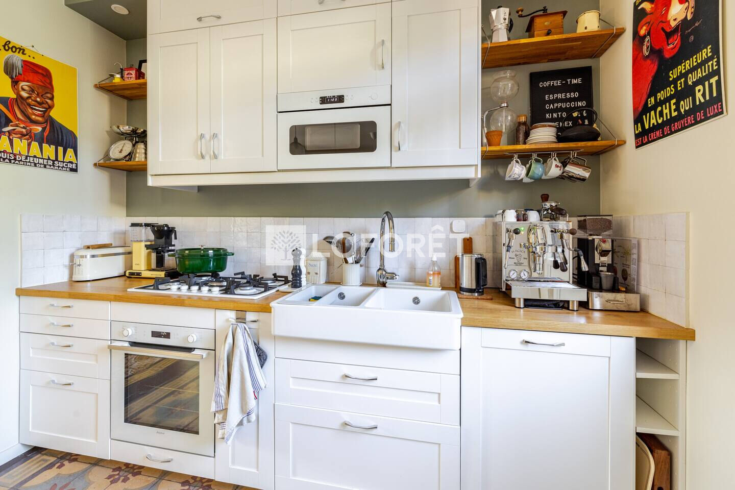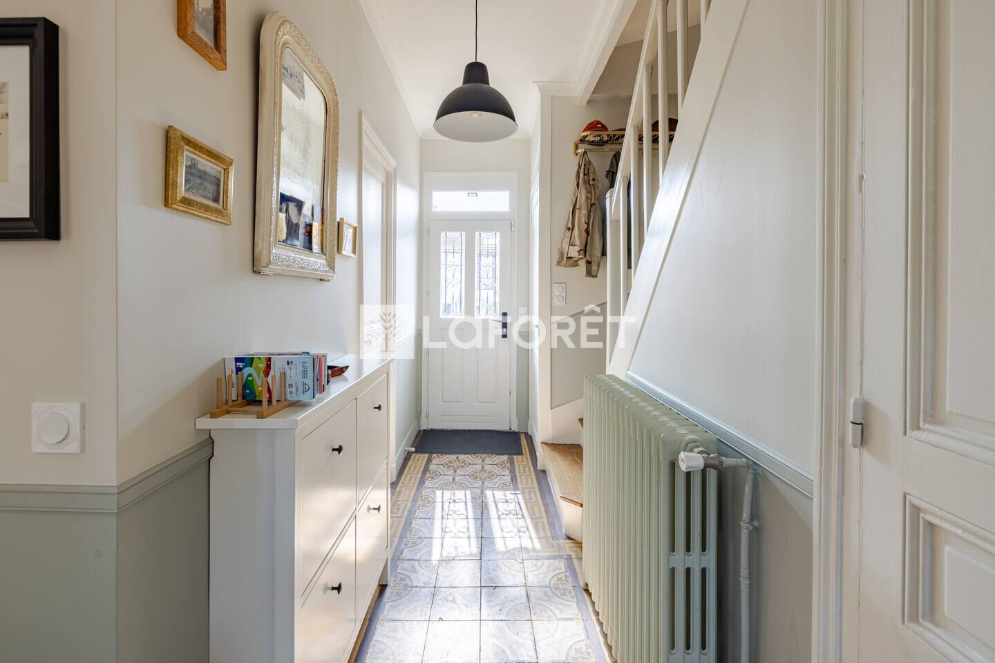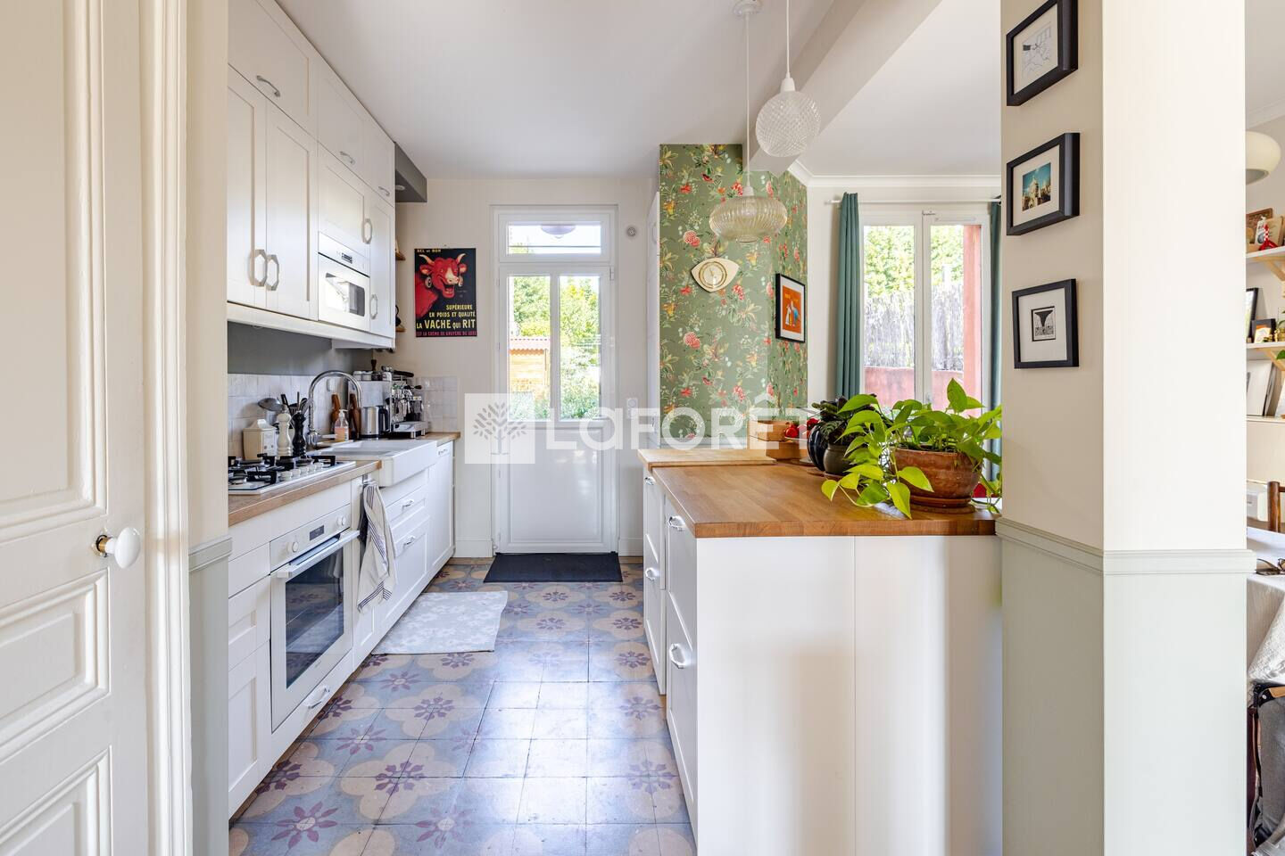 Construite sur un terrain d'une surface de 264m², elle se compose au rez-de-chaussée d'une jolie entrée avec des carreaux de ciment ancien d'origine, d'un séjour-salle à manger parquet chêne d'origine, d'une cuisine américaine entièrement équipée, donnant accès à une terrasse de 30m² et d'un cabinet de toilettes séparé.