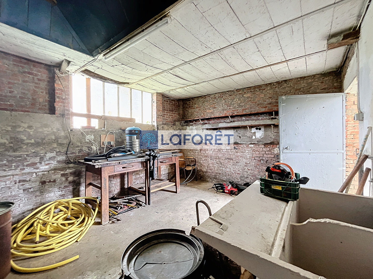 Au premier niveau, un couloir vous mène à une élégante salle à manger avec plancher en bois et cheminée en marbre, ainsi qu'à un salon chaleureux avec plancher en bois et cheminée. La cuisine lumineuse, bien que non équipée, s'ouvre sur une terrasse en béton et un jardin. Ce niveau comprend également une salle d'eau moderne avec douche à l'italienne, d'un espace buanderie, des WC séparés, et un atelier ou buanderie de 18 m² avec grenier.