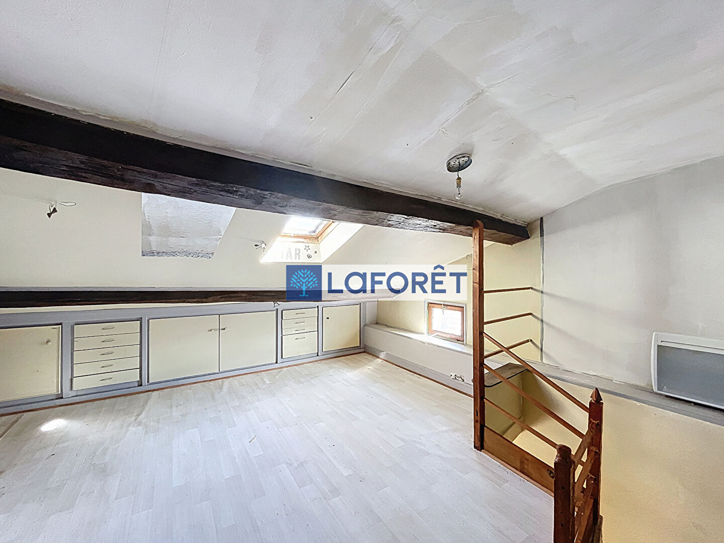Le premier appartement d'environ 54 m² se compose au rez-de-chaussée d'une pièce de vie avec coin cuisine et d'une cave au premier étage d'un palier avec placard d'une salle d'eau avec wc et d'une grande chambre et au deuxième étage d'une chambre mansardée avec rangements