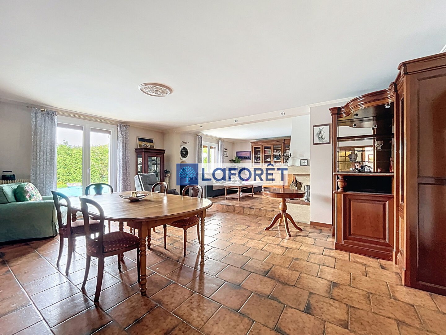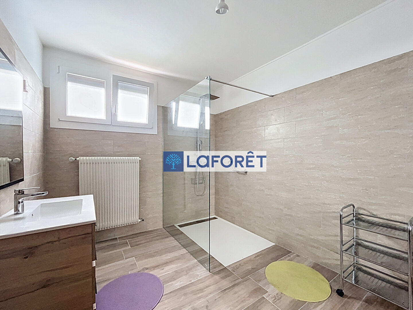 Le rez-de-chaussée se compose d'un hall d'entrée desservant une cuisine aménagée avec accès direct à une terrasse couverte, un vaste séjour lumineux avec cheminée, deux chambres, une salle de bains avec douche à l'italienne et un WC.