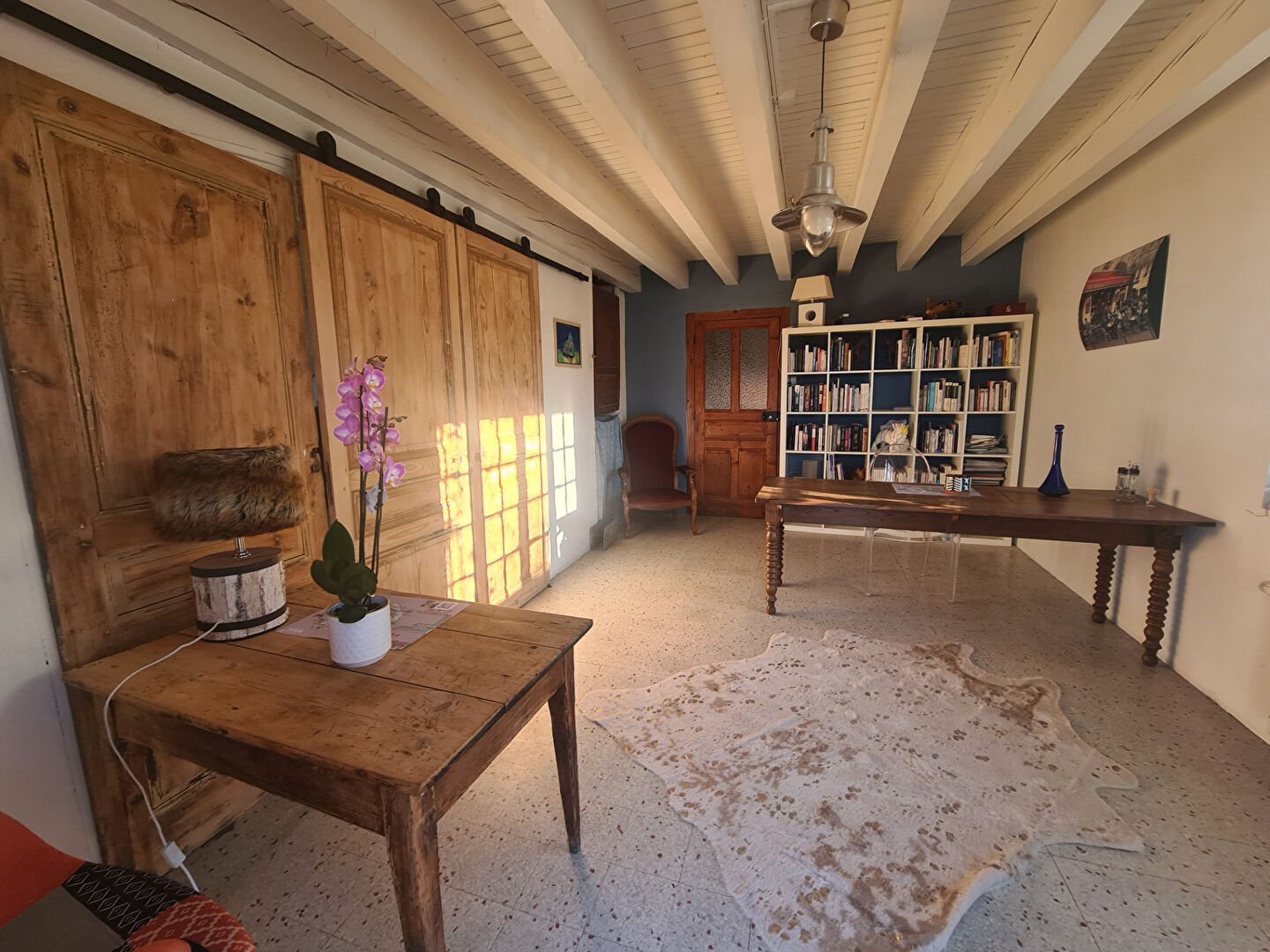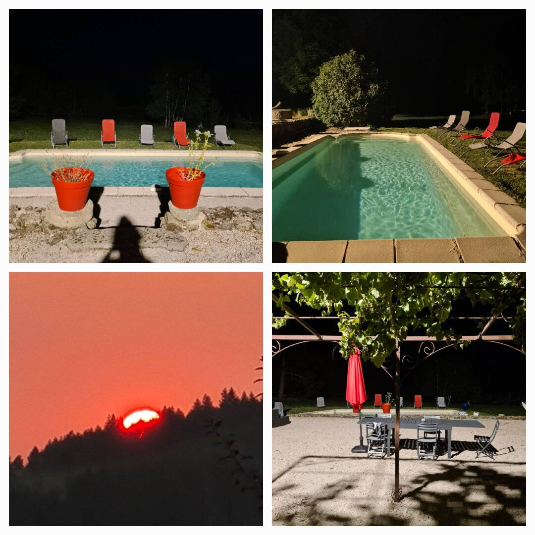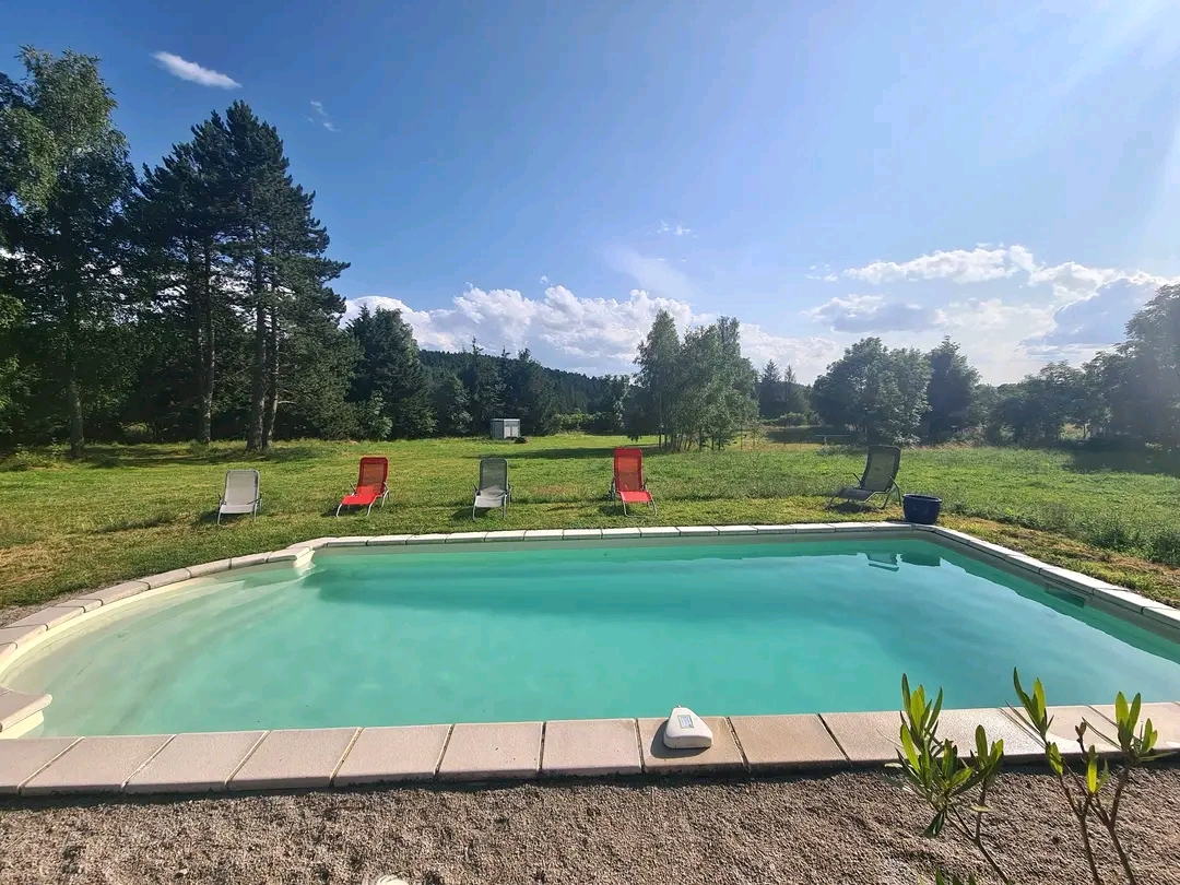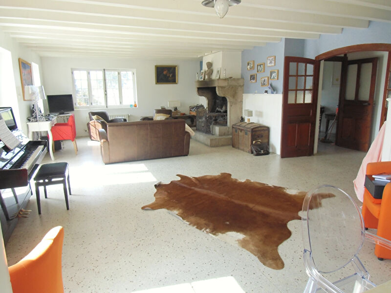 En rez de chaussée, vaste double séjour avec cheminée et poêle à bois ouvert sur terrasse et piscine, cuisine équipée et toilettes.