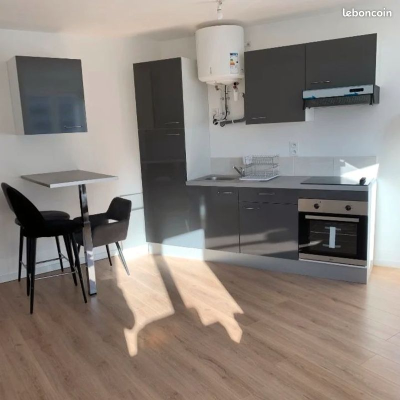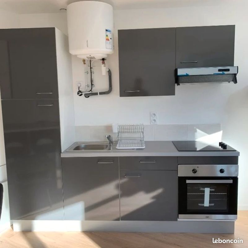 Composé d'une cuisine entièrement équipée et meublée avec four, hotte, plaque de cuisson, frigo et rangements