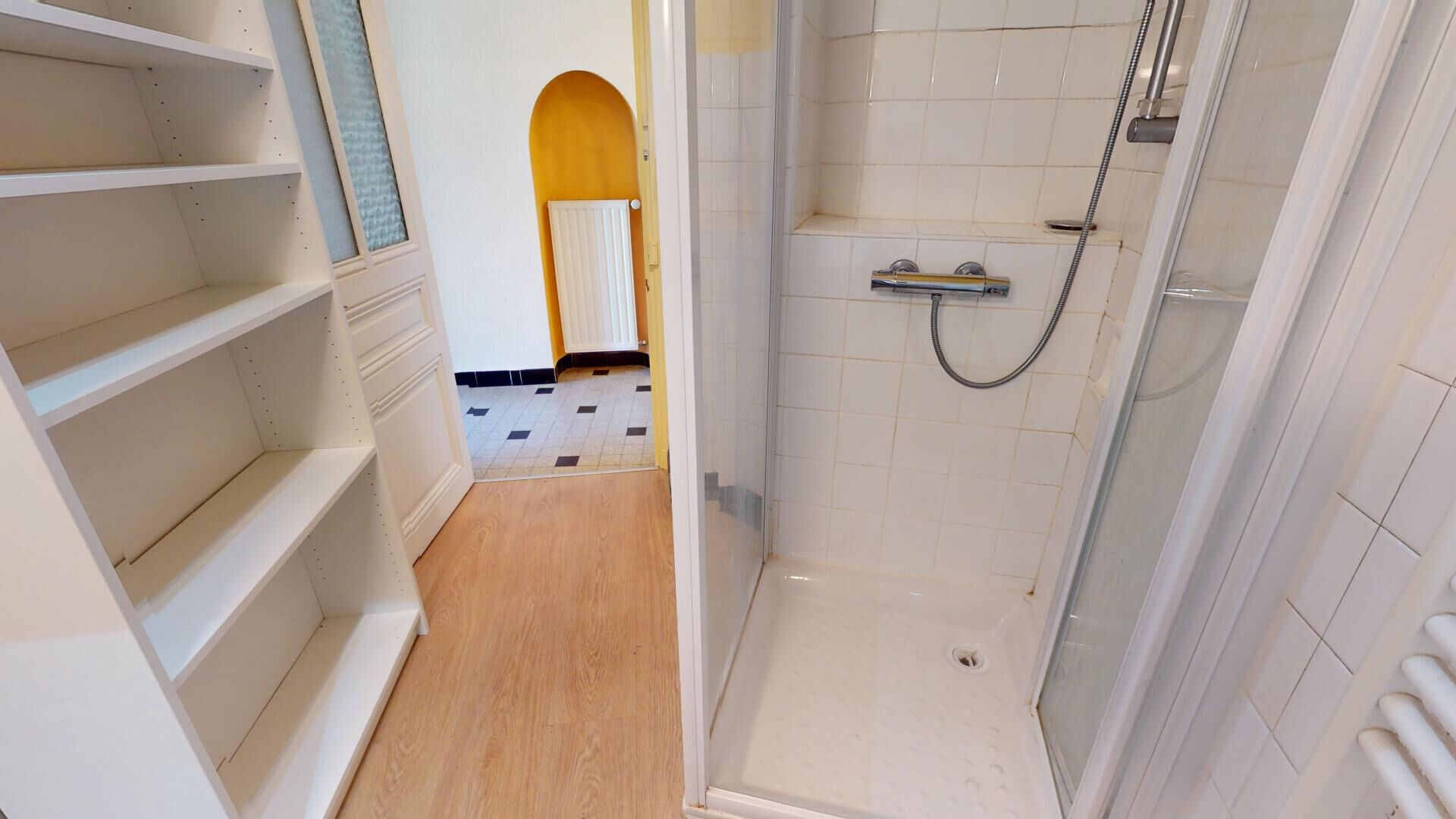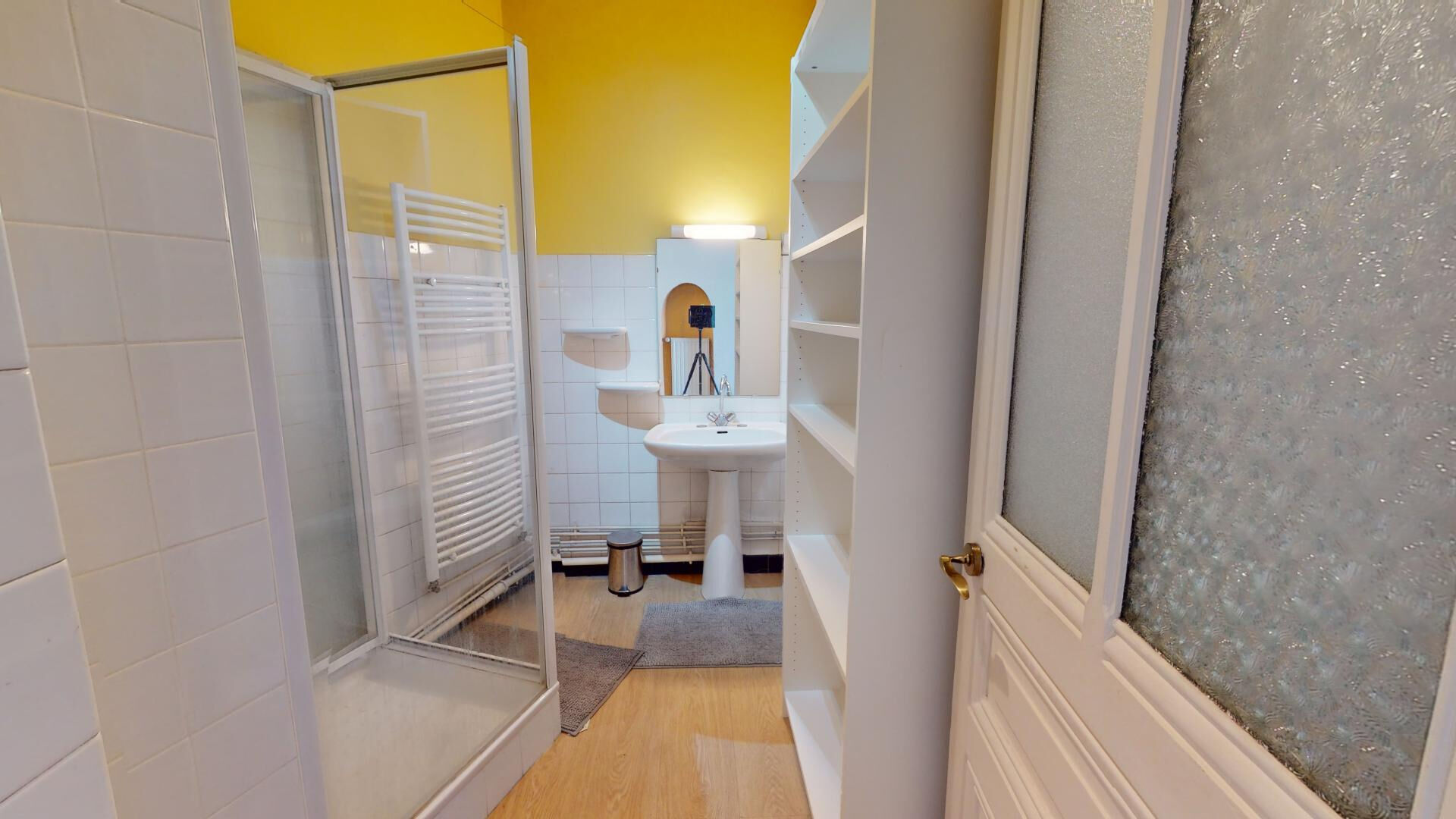 La salle de bains est équipée d'une douche, sèche serviette, rangements.