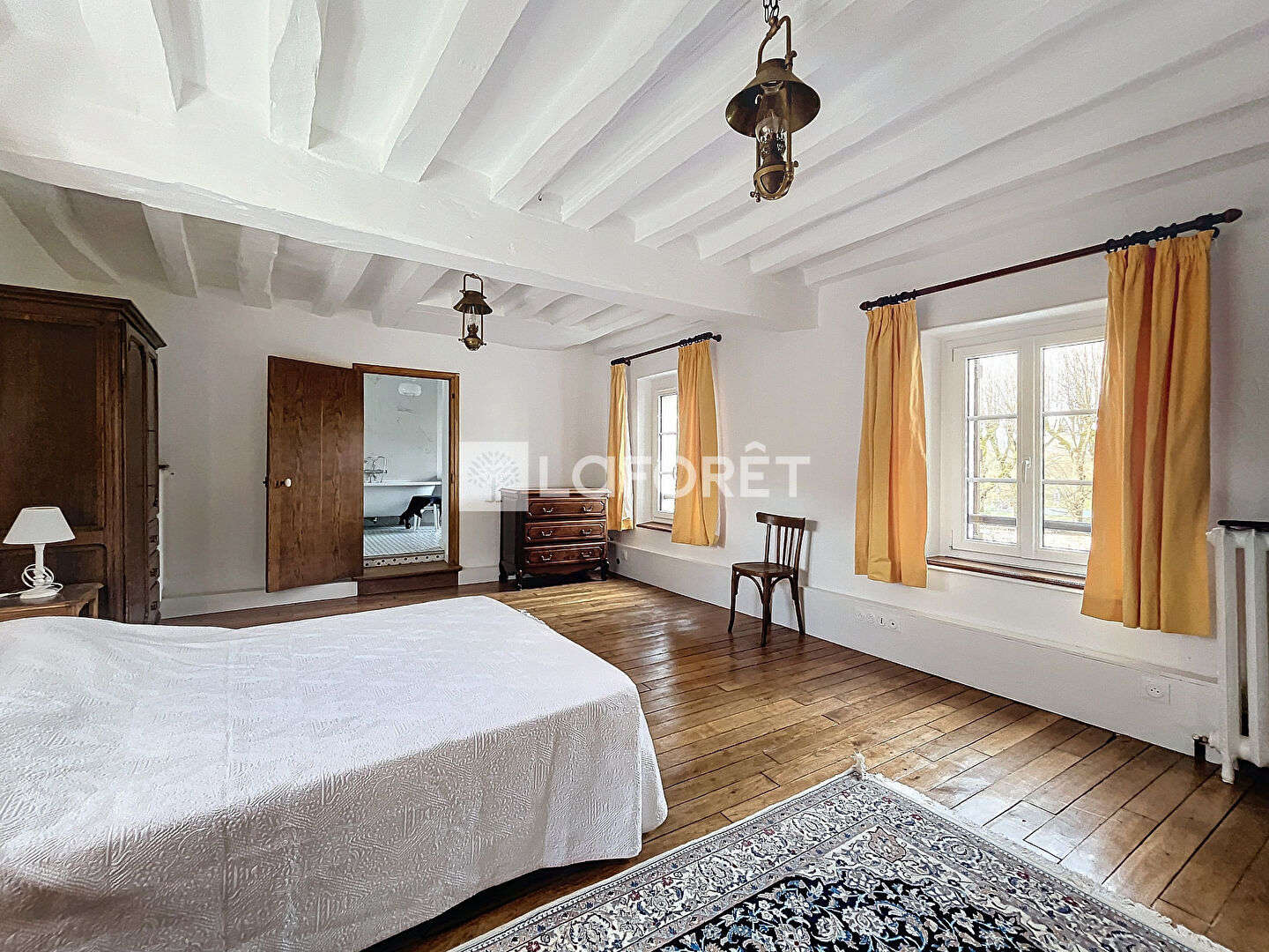 Au premier étage : Un palier dessert une suite parentale spacieuse et lumineuse, avec sa salle de bain et WC, une seconde chambre généreuse complète cet étage. Les sols d'origine en bois et les poutres apparentes renforcent l'ambiance chaleureuse.