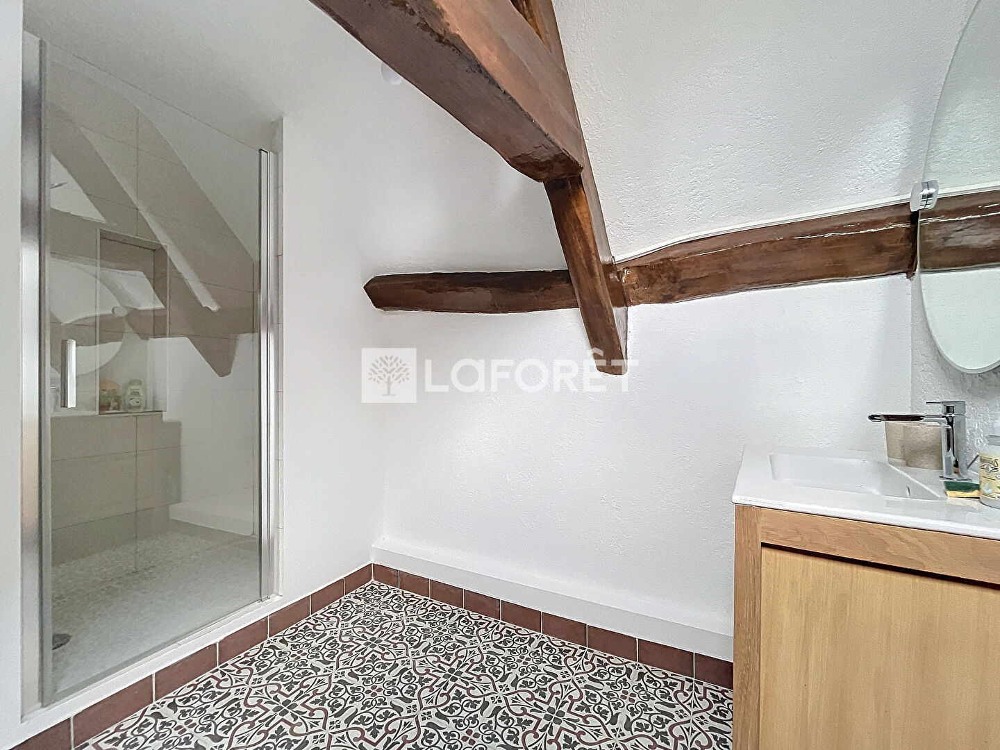 Au deuxième étage : Un dégagement, avec un espace de rangement, dessert une chambre sous les combles et une salle d'eau au caractère unique.
