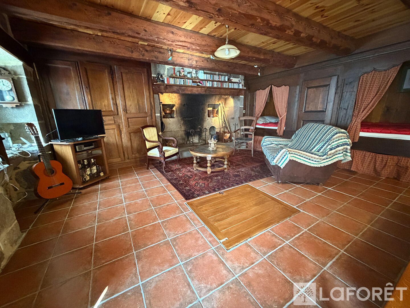 - au rez-de-chaussée : une pièce de vie avec cuisine ouverte, "cantou" et lits alcôves, un cellier et WC.