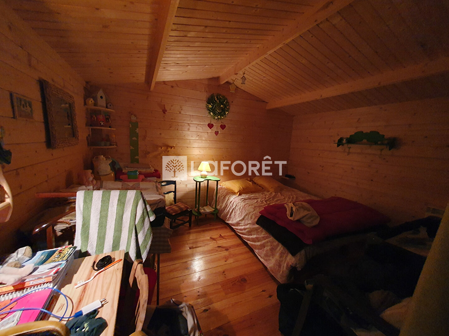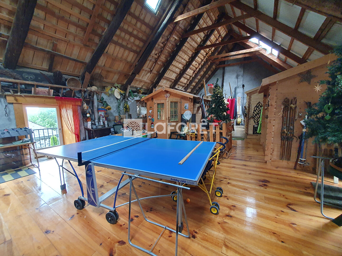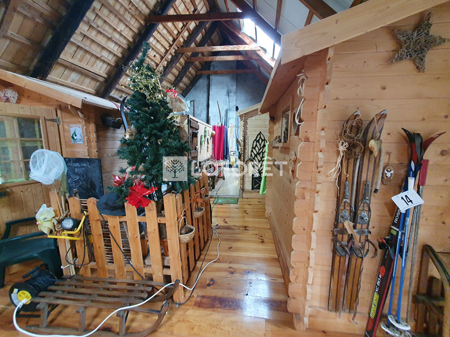 - A l'étage nous retrouvons la grange aménagée avec différents chalets offrant six couchages supplémentaires répartis en trois chalets distincts isolés et chauffés individuellement. Nous trouvons également un chalet "sanitaire" avec un lavabo et WC sanibroyeur, ainsi qu'un espace atelier ouvert sur ce même niveau. La surface au sol de la grange est d'environ 130 m².