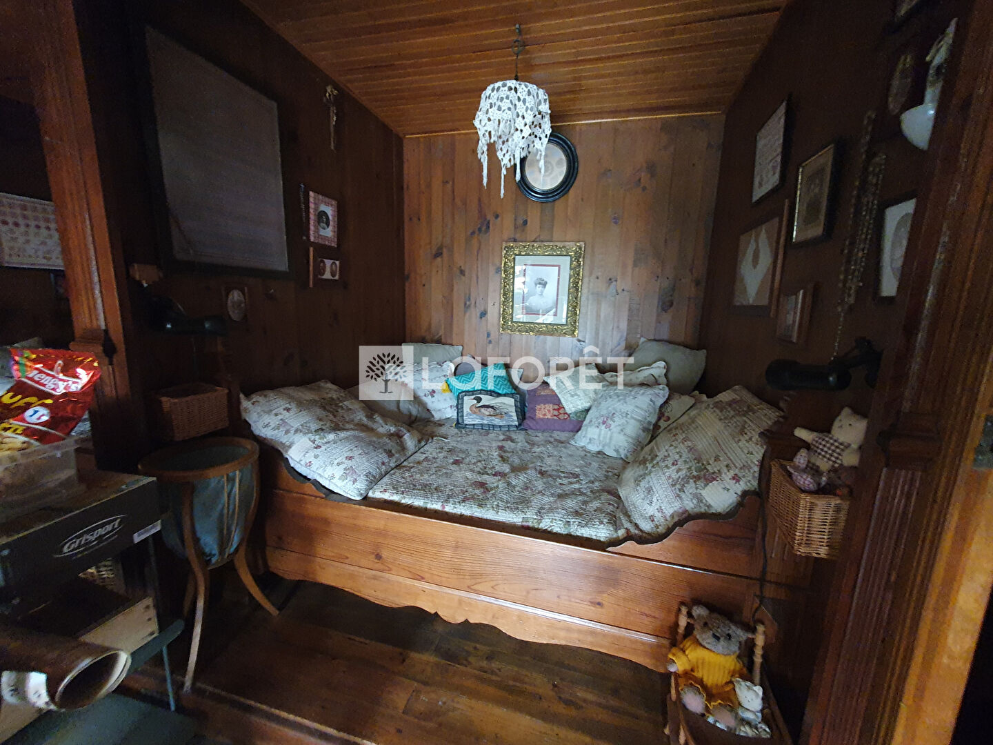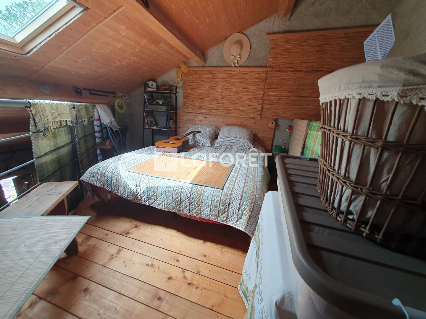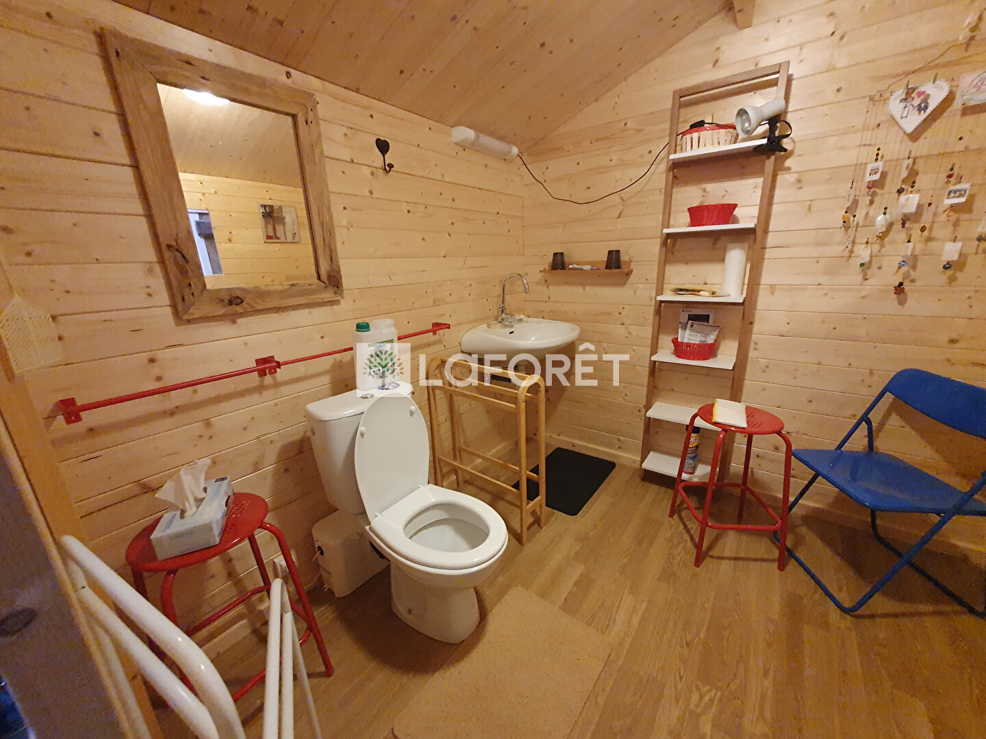 - A l'étage nous retrouvons la grange aménagée avec différents chalets offrant six couchages supplémentaires répartis en trois chalets distincts isolés et chauffés individuellement. Nous trouvons également un chalet "sanitaire" avec un lavabo et WC sanibroyeur, ainsi qu'un espace atelier ouvert sur ce même niveau. La surface au sol de la grange est d'environ 130 m².