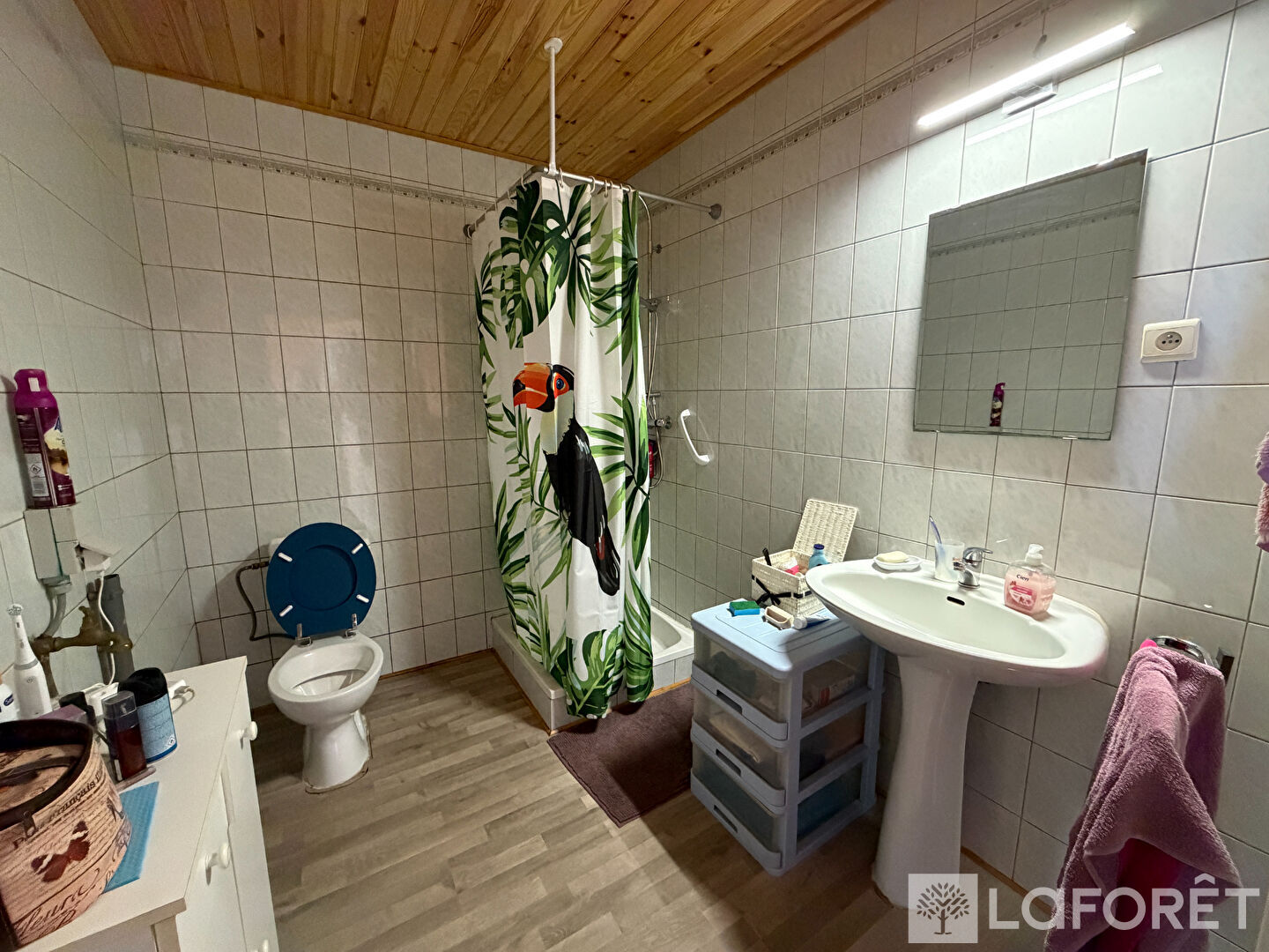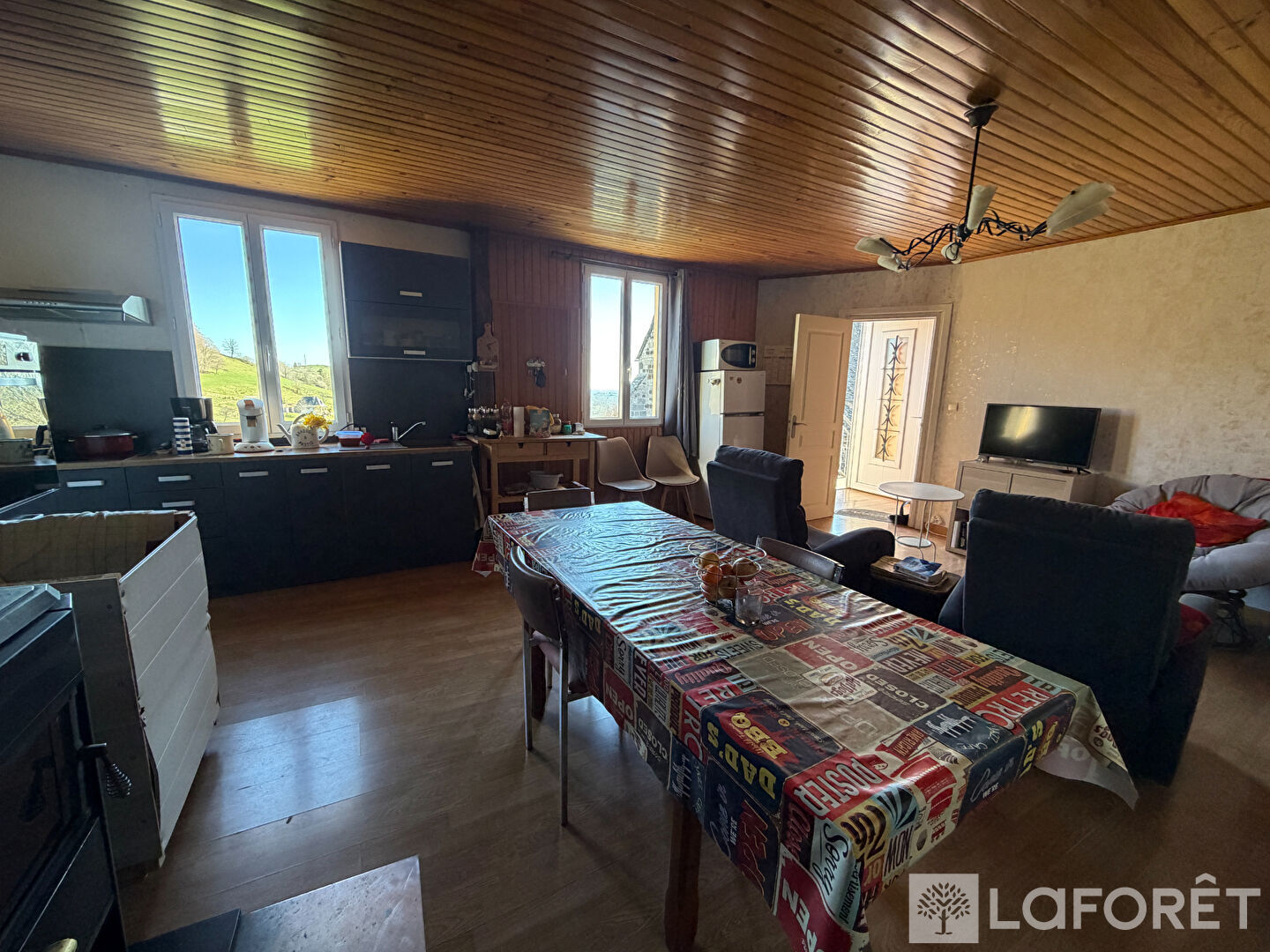- Au premier étage avec accès de plain pied à l'arrière de la maison une pièce de vie comprenant salon/salle à manger et cuisine ouverte, trois chambres et une salle d'eau avec WC.