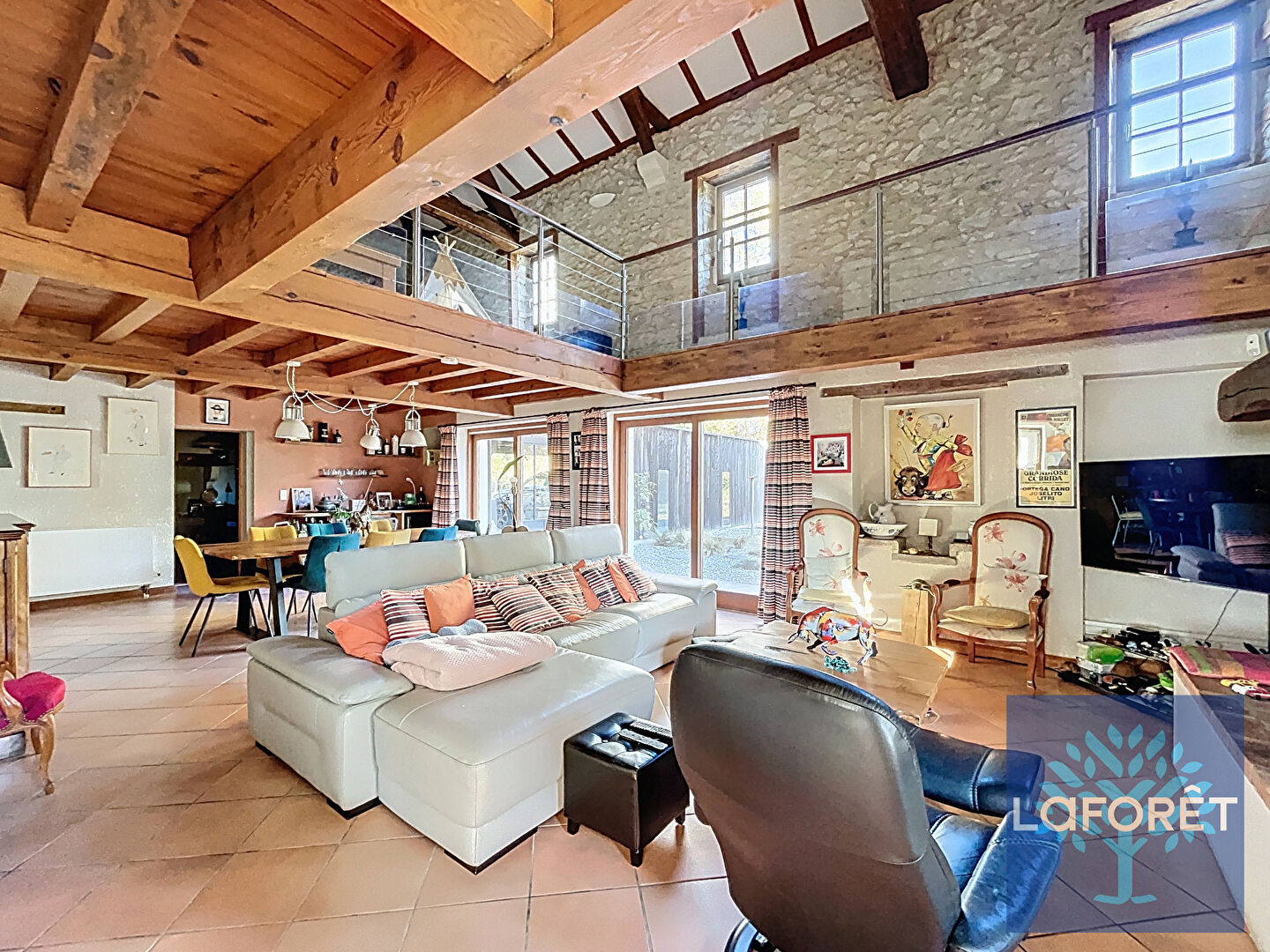 Un séjour spacieux de 53 m², traversant et chaleureux, mettant en valeur les matériaux nobles d'origine, et une grande mezzanine surplombant le séjour et sa cheminée en pierre de taille.