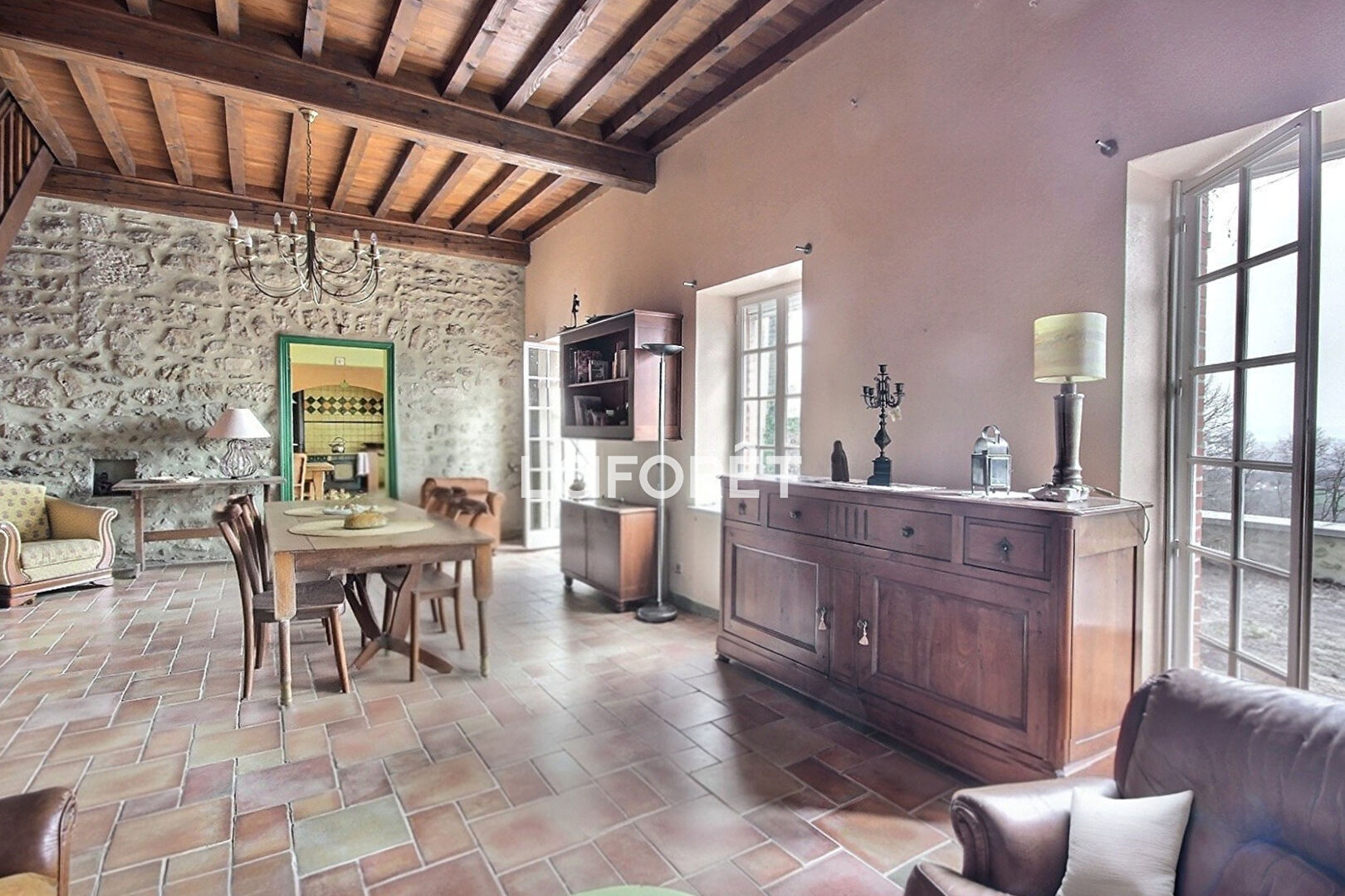 Un premier escalier descend vers la pièce de vie principale, coeur de la maison. La vaste salle de réception de 45 m², avec sa cheminée en pierre à foyer ouvert, s'ouvre sur une cuisine généreuse et fonctionnelle, toutes deux donnant directement sur la terrasse et le jardin. La hauteur sous plafond et les grandes ouvertures apportent une belle luminosité.