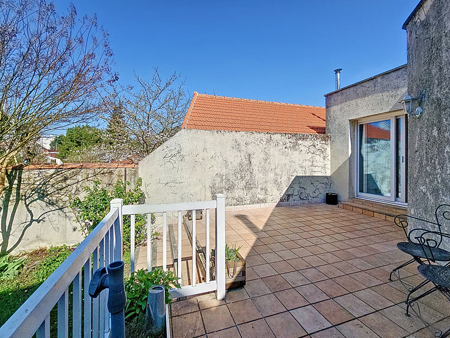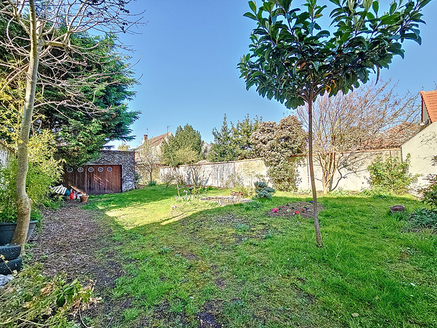 Un garage et place de parking extérieur au fond du beau jardin.