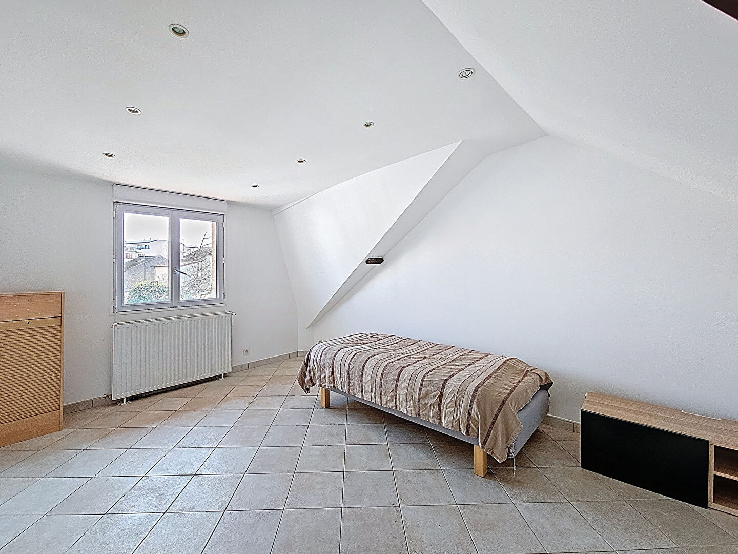 Au premier étage, nous y trouvons un palier qui dessert deux grande chambres, une salle de bains avec fenêtre.