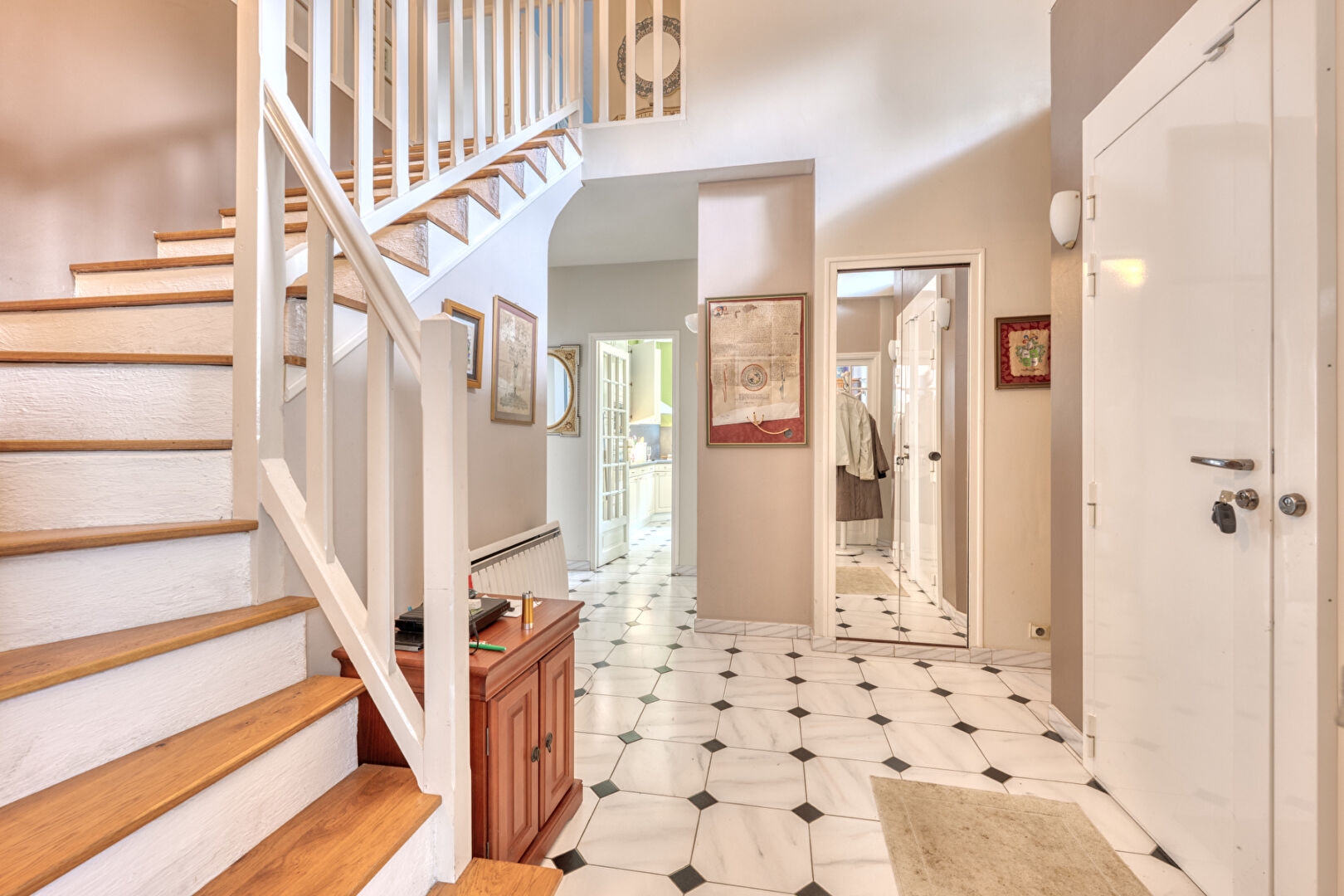 Entrée cathédrale avec rangements, toilettes, séjour triple avec cheminée offrant un accès direct sur la terrasse et le jardin, cuisine dinatoire, bureau.