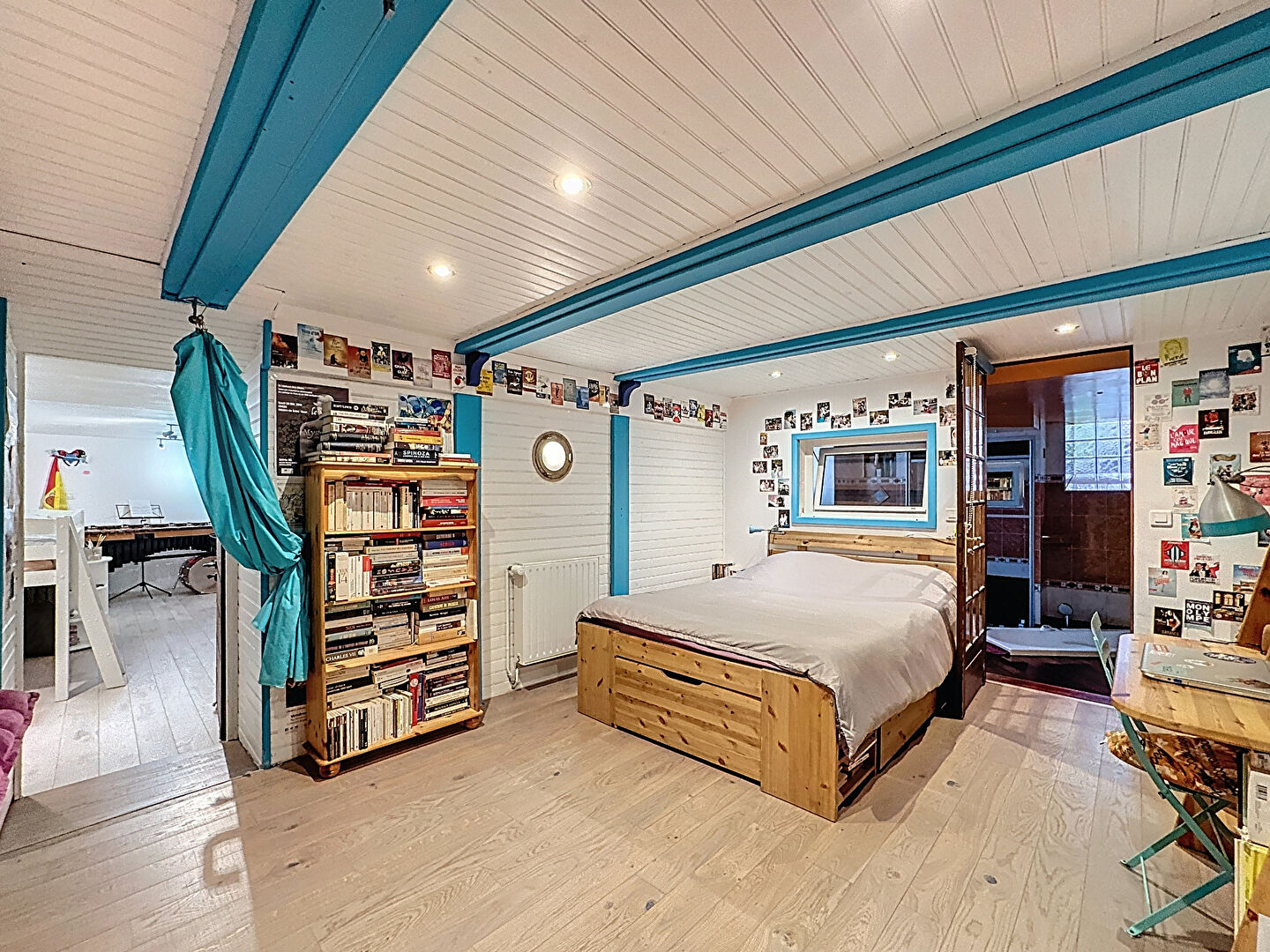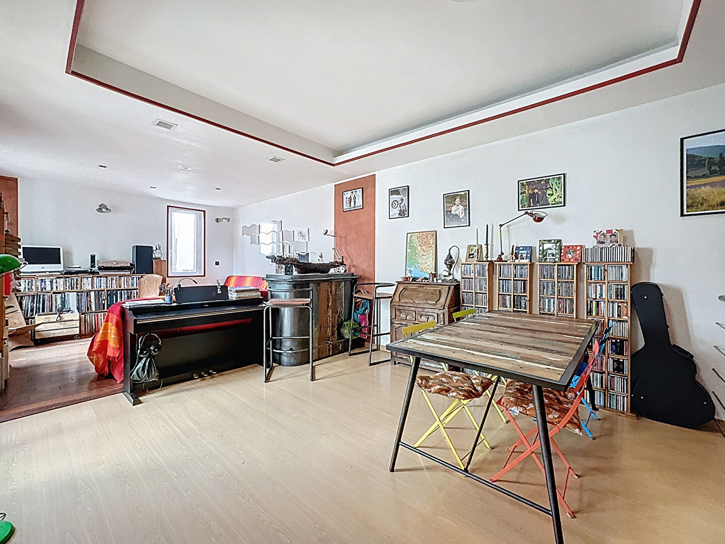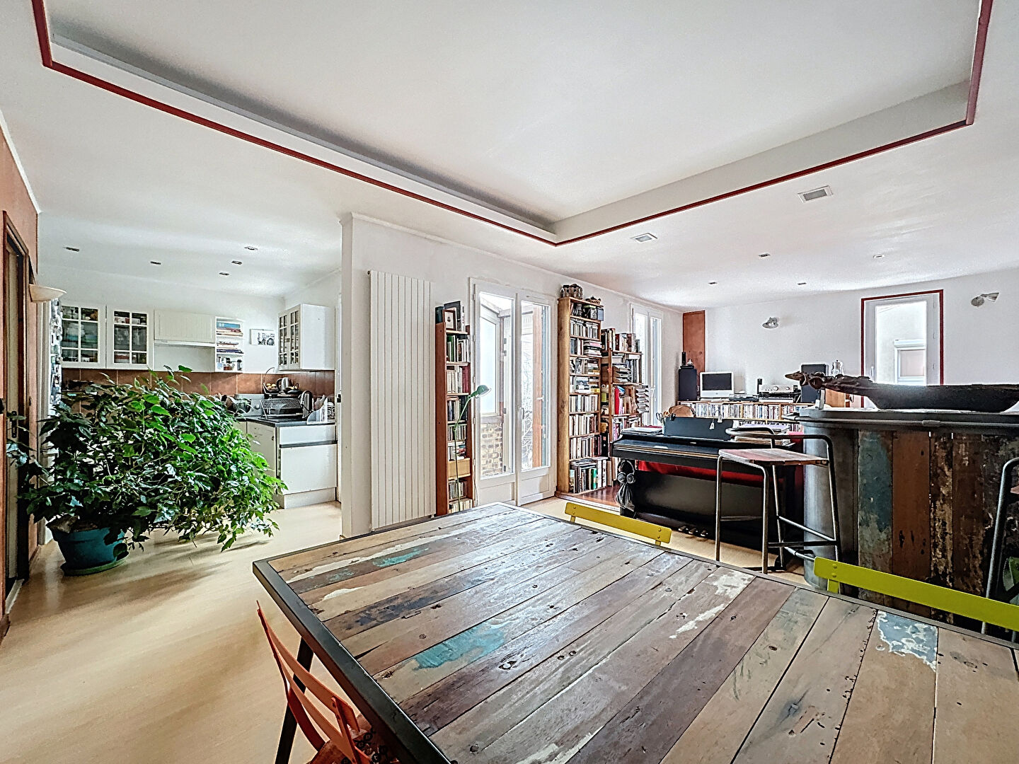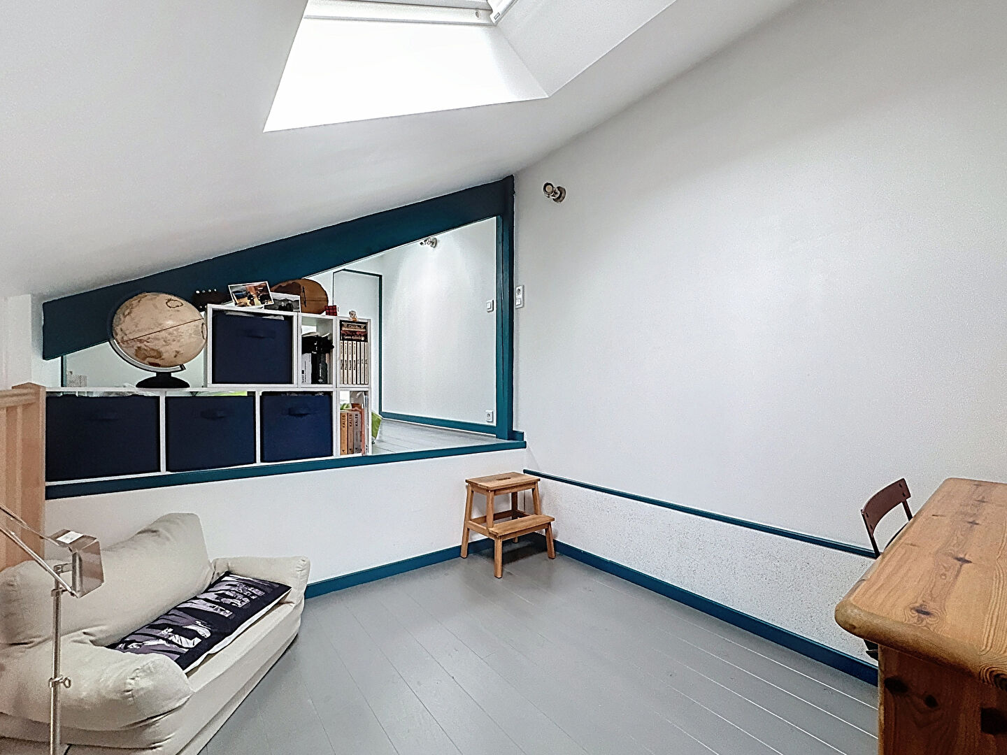 Un double séjour avec cuisine ouverte équipée, une salle d'eau avec W.C et une chambre avec mezzanine (espace bureau + 2ème chambre enfant), accès direct sur une terrasse exposé plein SUD depuis le séjour