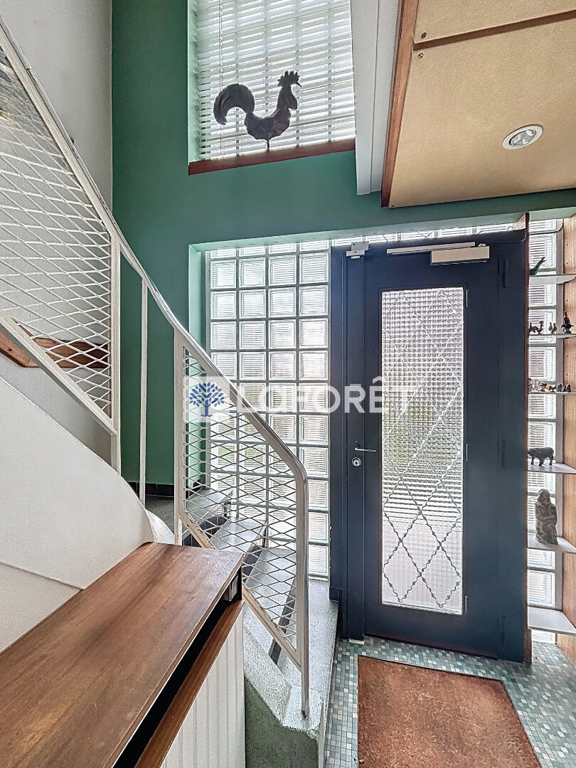 Au rez-de-chaussée, l'entrée cathédrale baignée de lumière grâce à ses carreaux de verre dessert un large escalier qui mène à l'étage, un couloir menant à un séjour traversant lumineux ouvrant d'un côté sur la terrasse et de l'autre sur le jardin (Ouest), un bureau, ainsi qu'une cuisine spacieuse avec accès à la terrasse et au jardin. Présence de WC invités avec espace lave-mains séparé et d'un vestiaire.