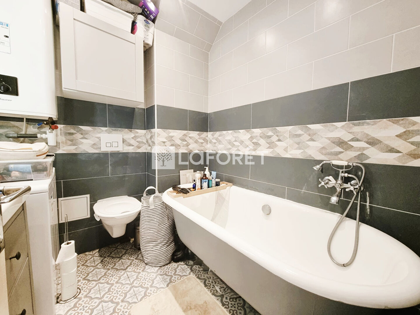 Vous serez séduit(e) par la salle de bains au charme unique, équipée d'une baignoire sur pieds, apportant une touche d'élégance et un confort rare dans ce type de bien. Le WC y est intégré pour plus de praticité.