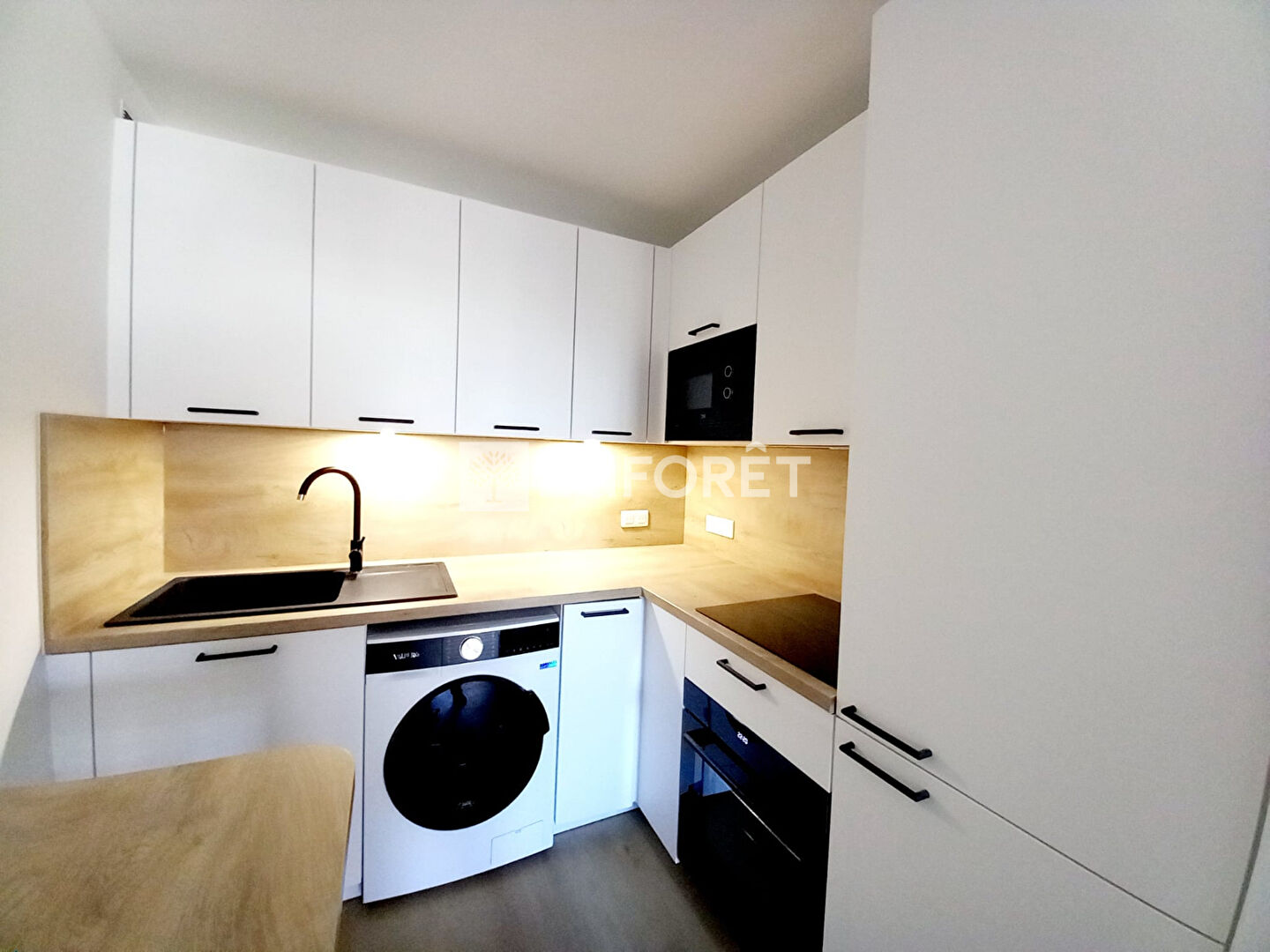 L'entrée distribuant un beau séjour avec coin cuisine aménagée et équipée avec un placard , Il se compose également d'une chambre avec placard, d'une salle de bains avec wc.
