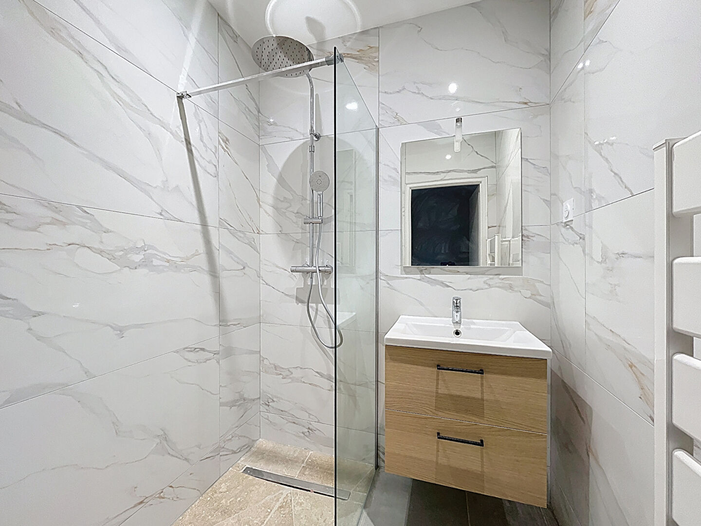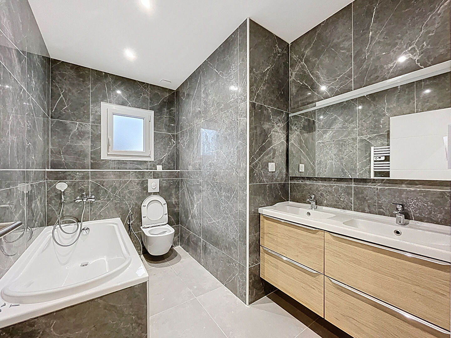 Vous trouverez également une salle de bains équipée d'un meuble double vasque, d'une baignoire et d'un WC, ainsi que trois chambres dont une suite parentale avec sa propre salle d'eau.