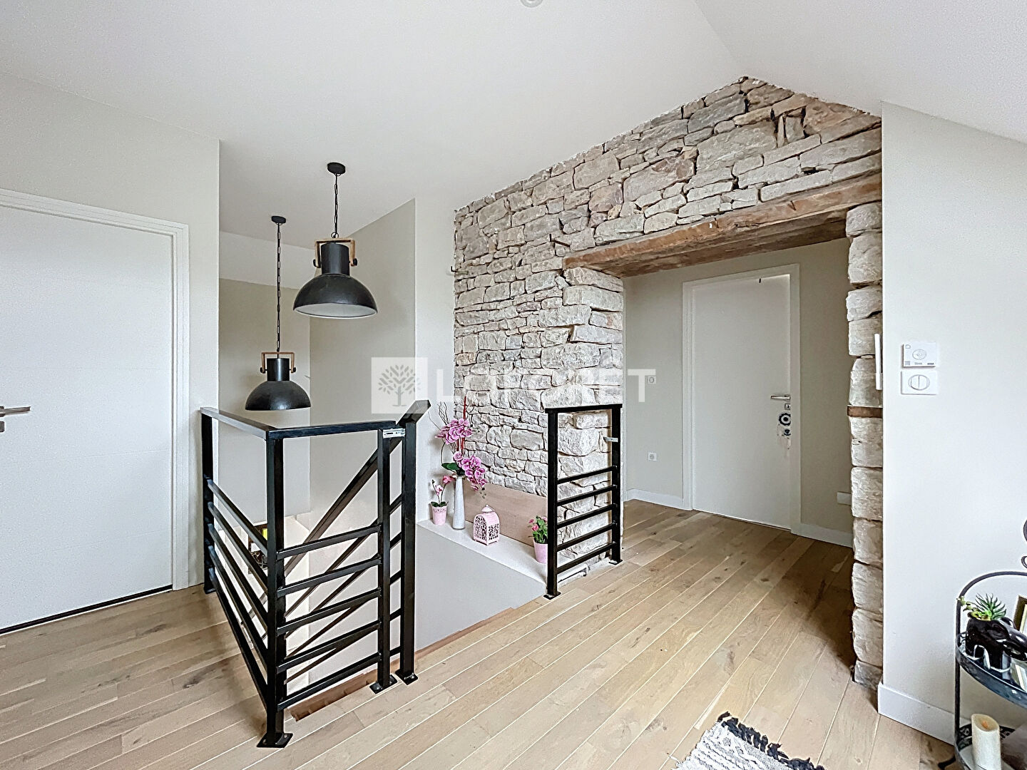 À l'étage : dégagement en pierre apparente desservant 2 grandes chambres avec salle de bains communicante, ainsi qu'une troisième chambre avec dressing et salle de bains privative.