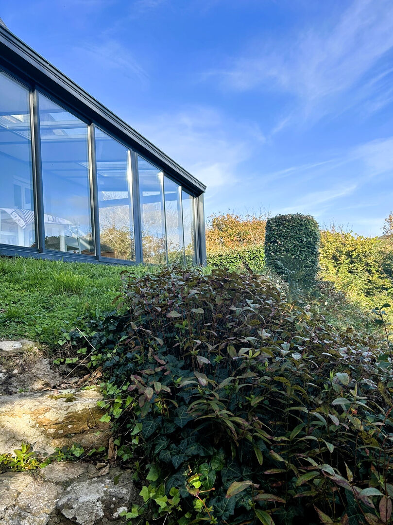 Son jardin, joliment arboré et aménagé sur plusieurs niveaux, offre un cadre paisible avec le grand potager, la terrasse sud-sud-ouest et la véranda lumineuse.