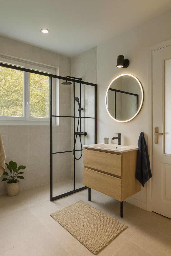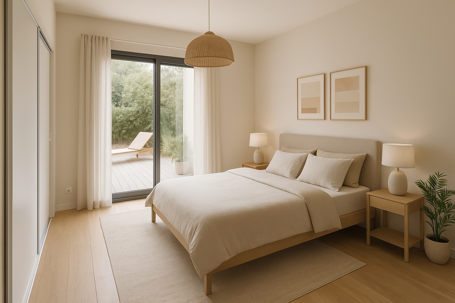 La cuisine ouverte sur la pièce de vie offre un accès direct à la terrasse. Le rez-de-chaussée est complété par un bureau, une salle de bains et une chambre baignée d'une douce lumière de fin de journée en rez-de-terrasse également.