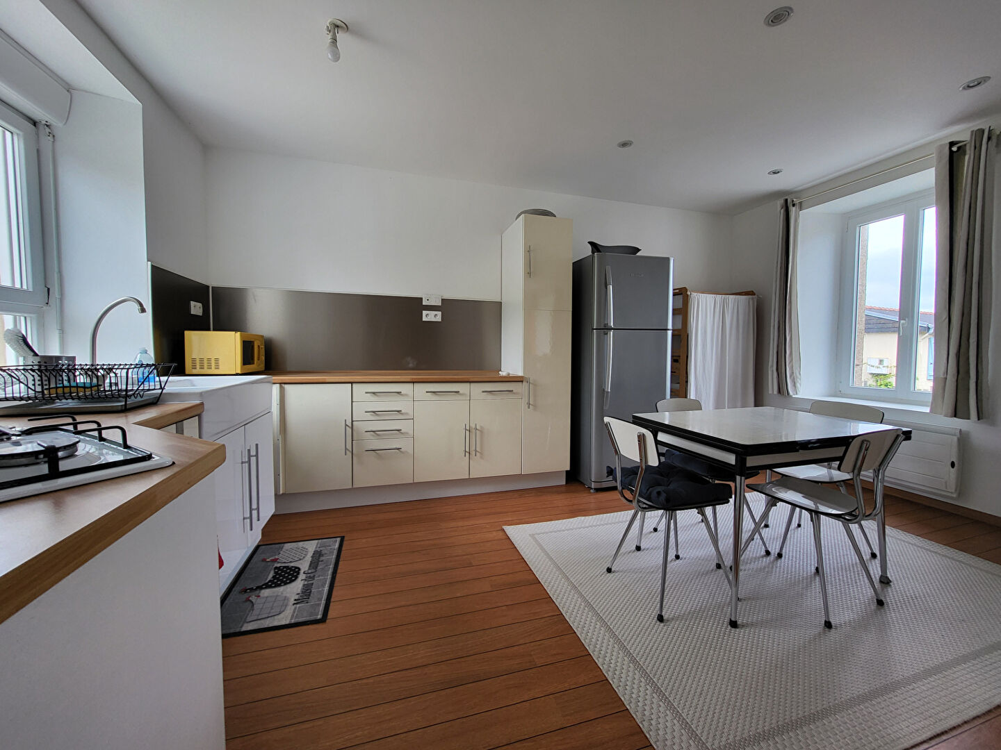 Elle dispose d'une cuisine ouverte sur pièce de vie, de deux chambres, d'une salle de bains et d'une pièce avec point d'eau à aménager selon vos souhaits.