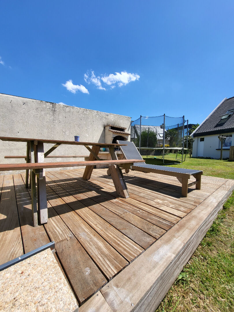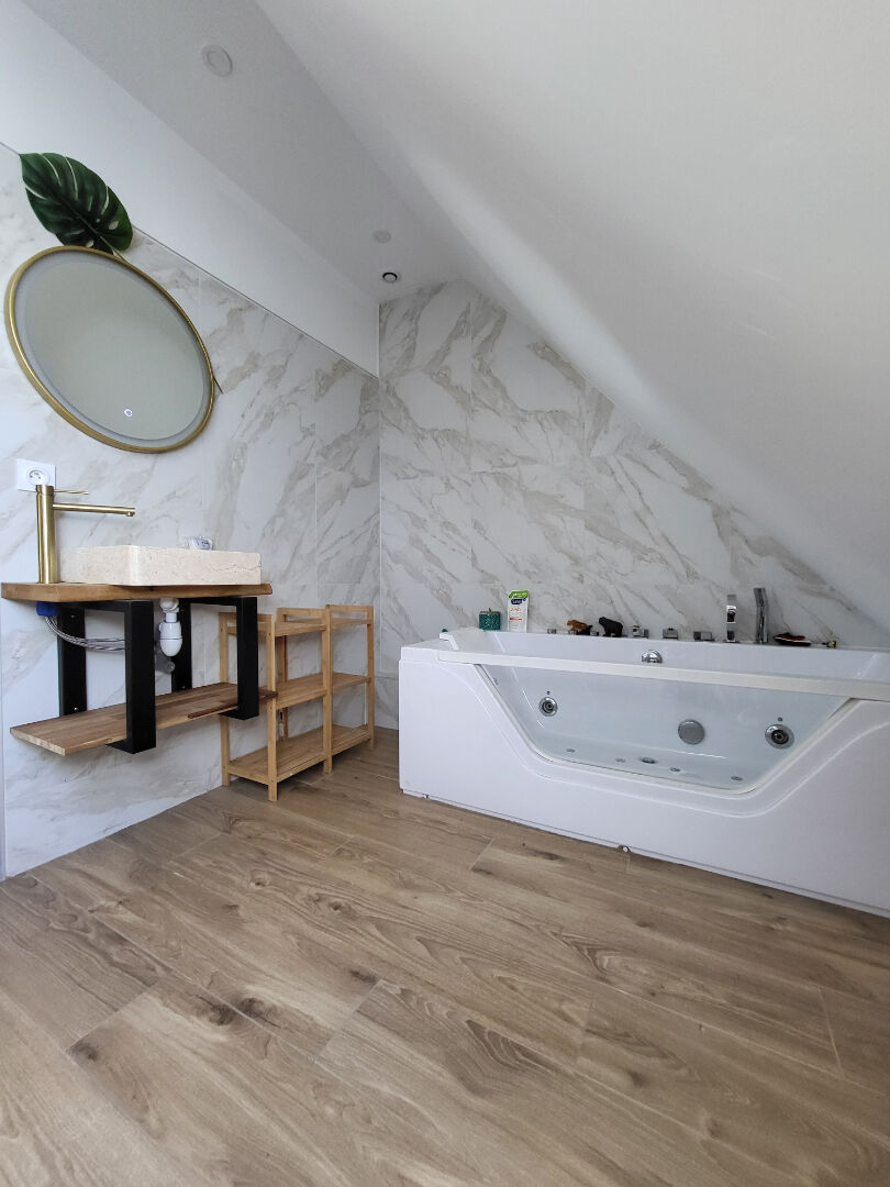 À l'extérieur, vous profiterez d'une vaste terrasse comprenant un espace détente avec jacuzzi, ainsi qu'un coin dédié aux activités de plein air, avec un abri de jardin pour le rangement.