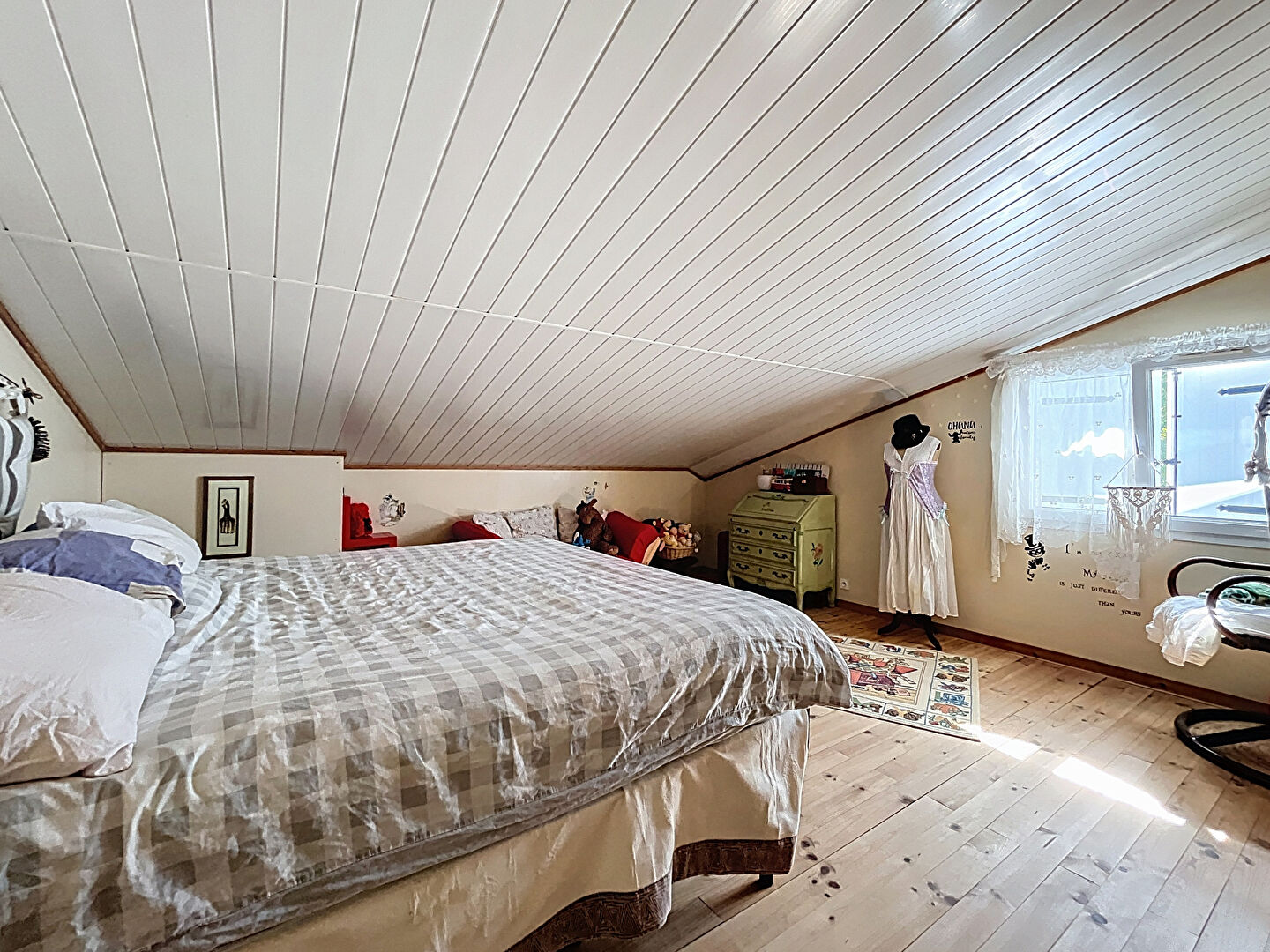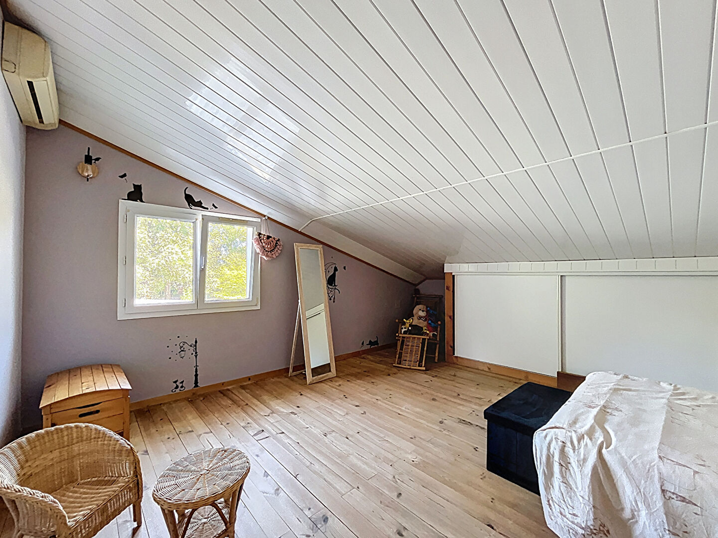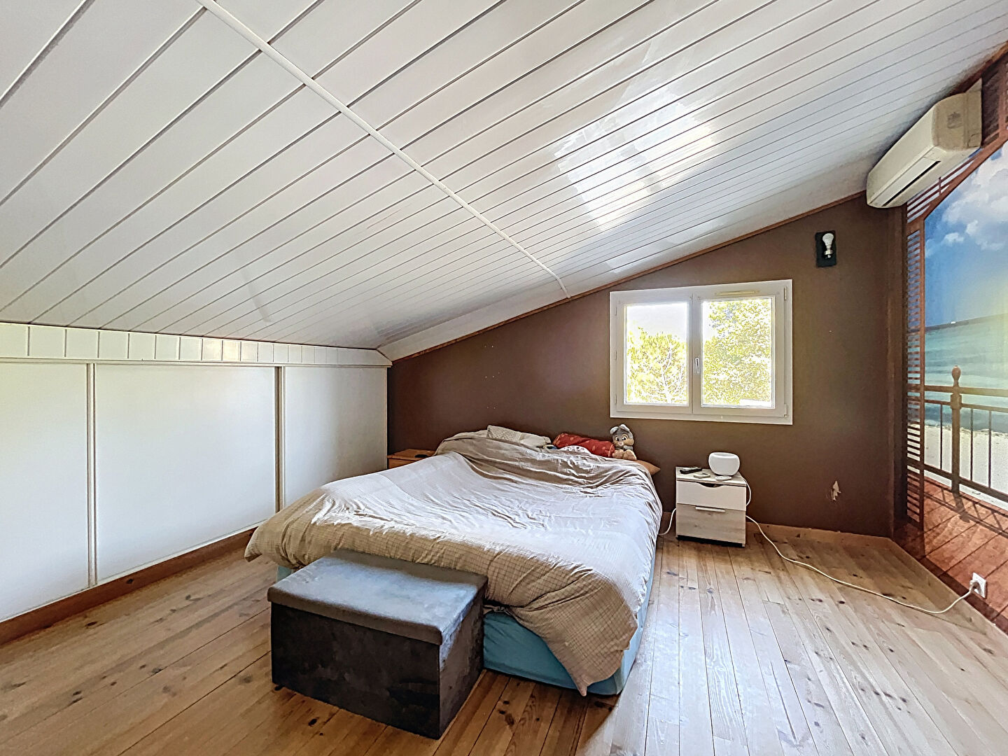À l'étage, vous trouverez trois grandes chambres avec rangements intégrés et un second WC indépendant. Chaque chambre est équipée d'un split de climatisation réversible, alimenté par une pompe à chaleur récente, assurant un confort optimal en toute saison.