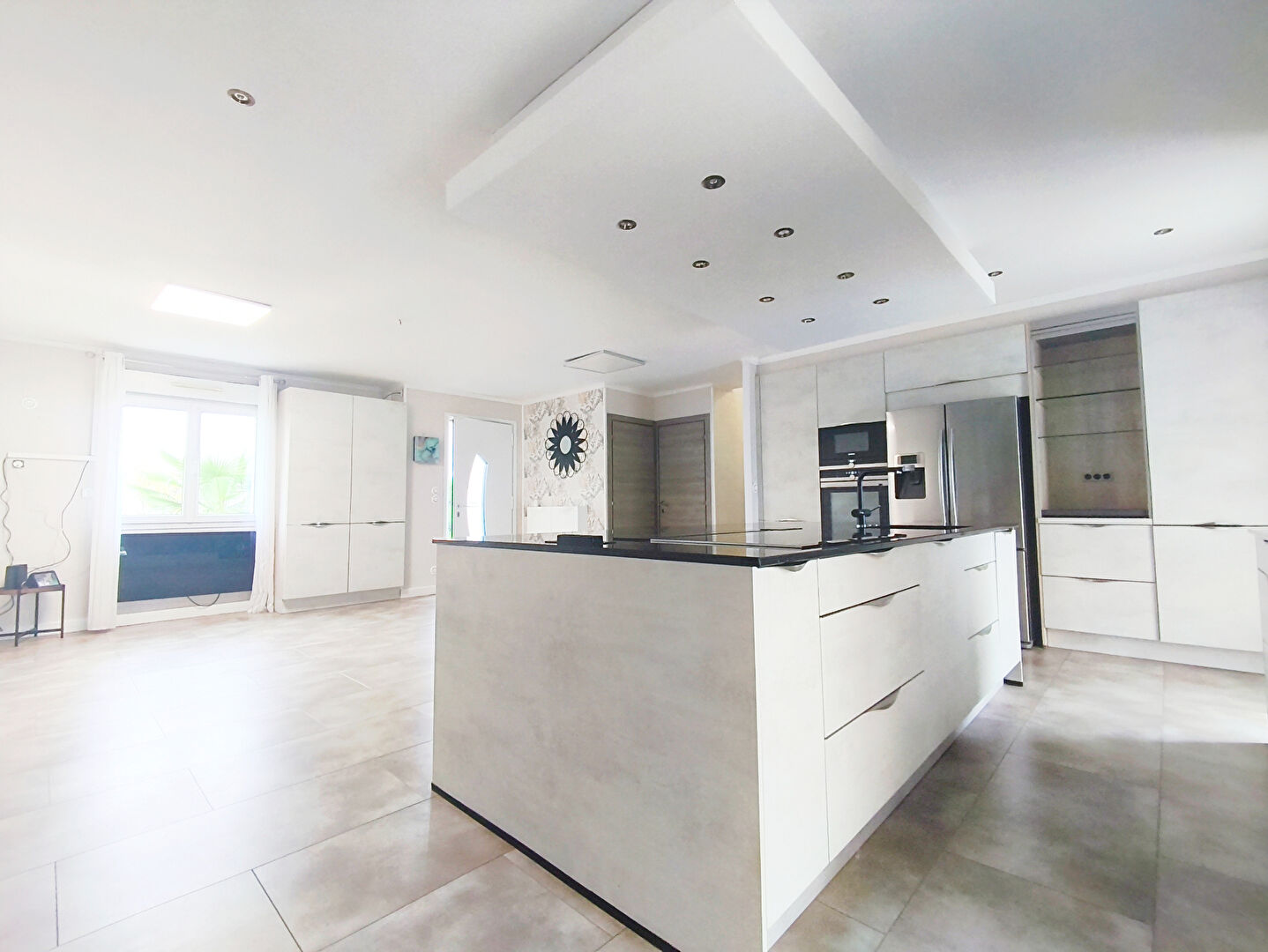 La maison offre de belles surfaces de vie réparties sur plusieurs niveaux. Le séjour lumineux s'ouvre sur une cuisine équipée avec un grand îlot central, cave à vins intégrée, réfrigérateur américain et hotte encastrée.