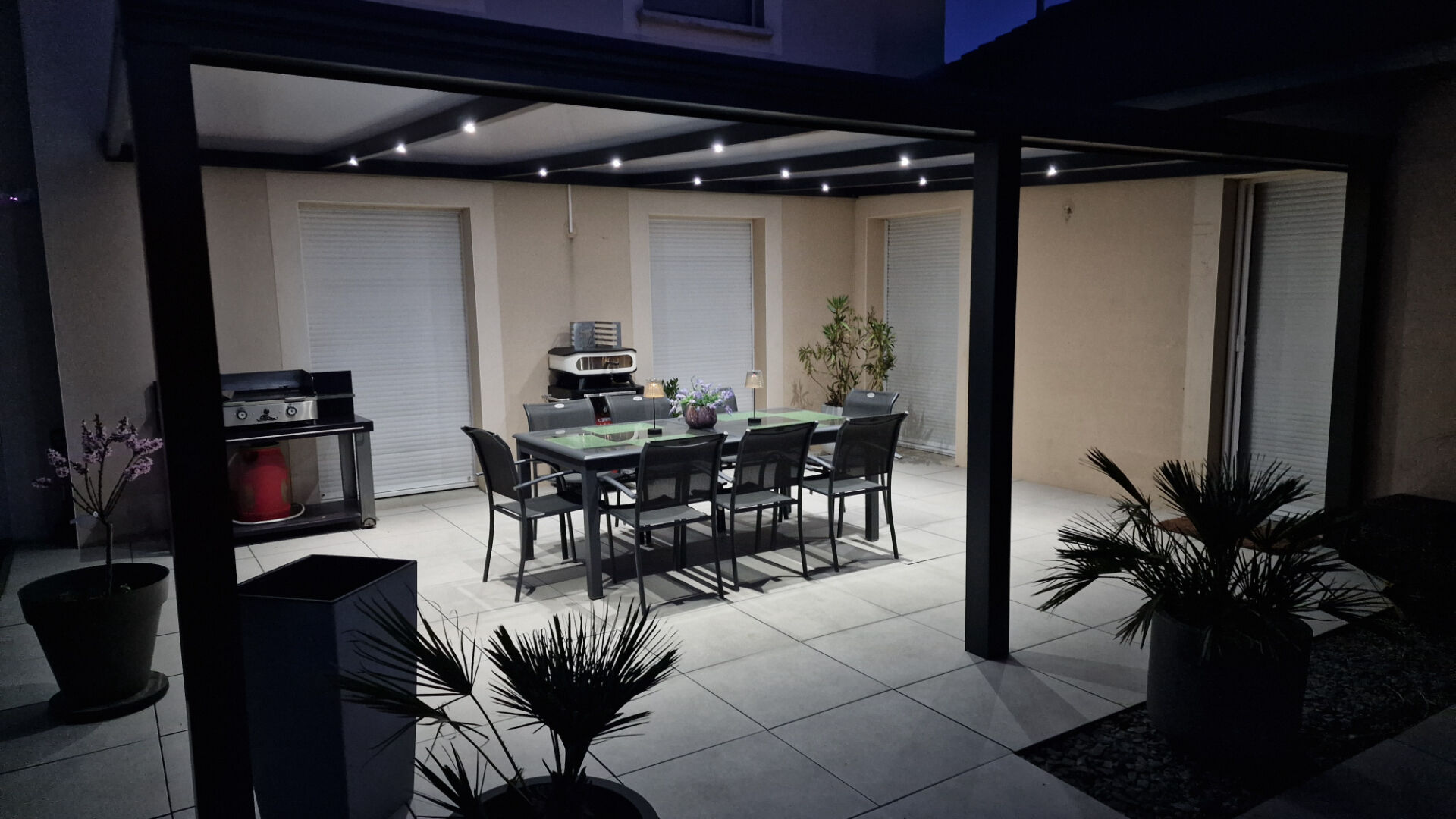 L'extérieur se compose d'un terrain clos de 819 m² soigneusement aménagé. Vous y trouverez un jardin arboré, un potager, un bassin à poissons, une terrasse de 36 m², et une pergola couverte en aluminium de 30 m² avec éclairage LED.