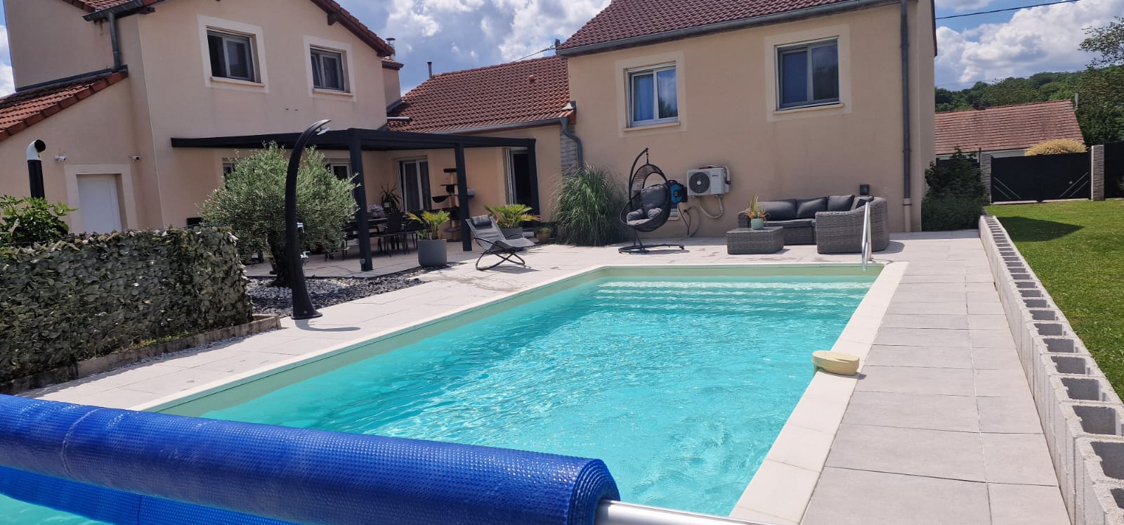 Une cuisine d'été avec barbecue et une piscine chauffée de 4 x 9 mètres avec système à contre-courant et dôme gonflable complètent l'ensemble.