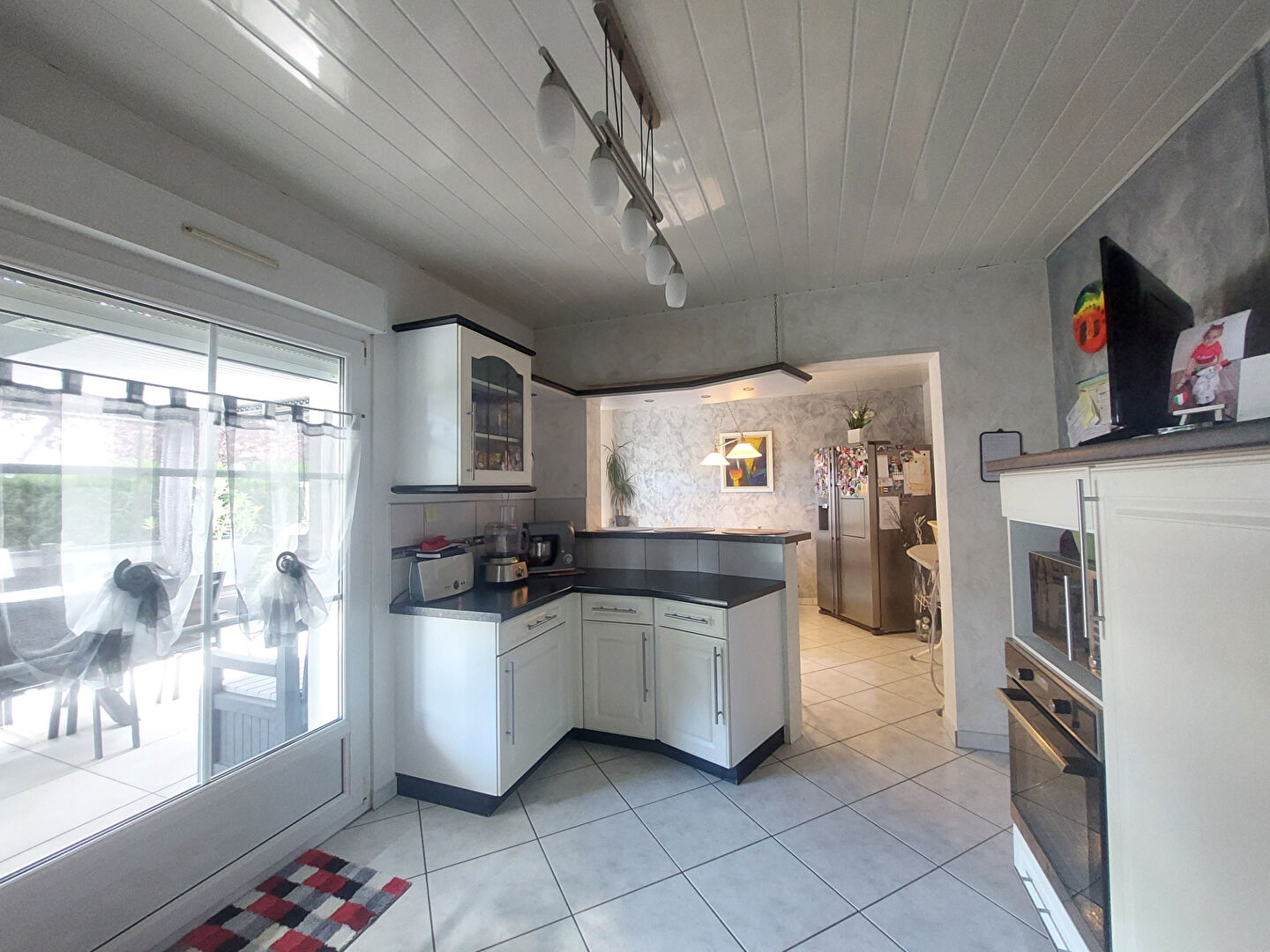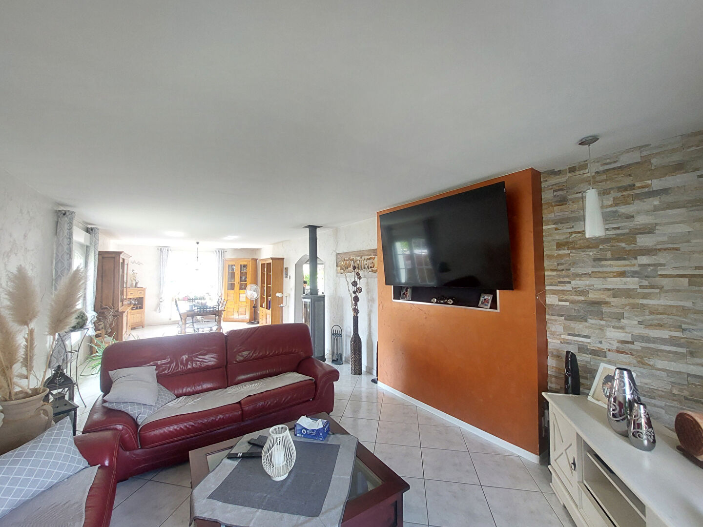 Un entrée, un salon/séjour lumineux équipé d'un poêle à bois avec un accès sur l' extérieur, une cuisine équipée ouverte sur un coin repas donnant sur la terrasse avec pergola, un dégagement, deux chambres, une spacieuse salle de bain avec baignoire et meuble de qualité, un wc et un garage porte motorisé.
