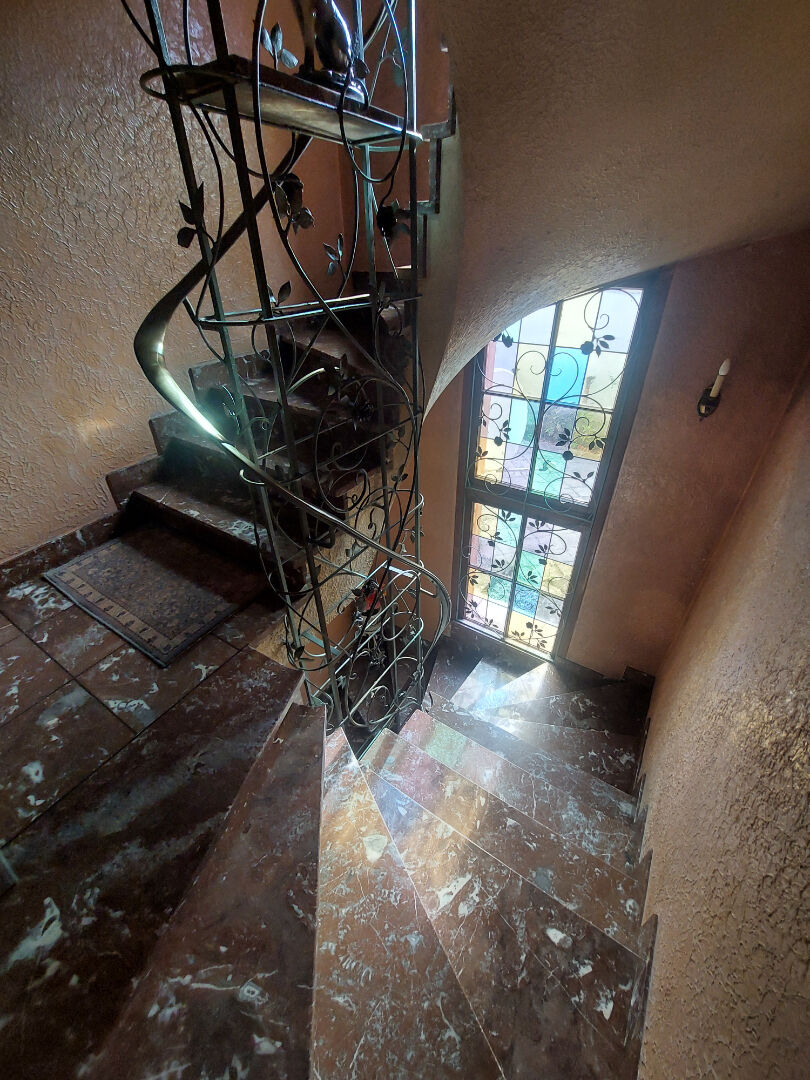 Un escalier en marbre et garde corp en fer forgé dessert les différents étages .