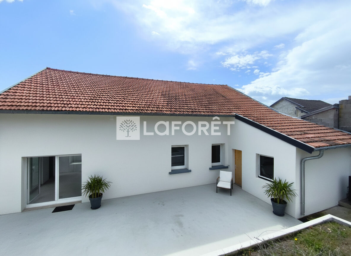 L'entrée s'ouvre sur une pièce de vie comprenant un salon, une cuisine équipée et une salle à manger. Cet espace donne directement accès à une terrasse de 60 m² et au terrain, également accessible par l'arrière.