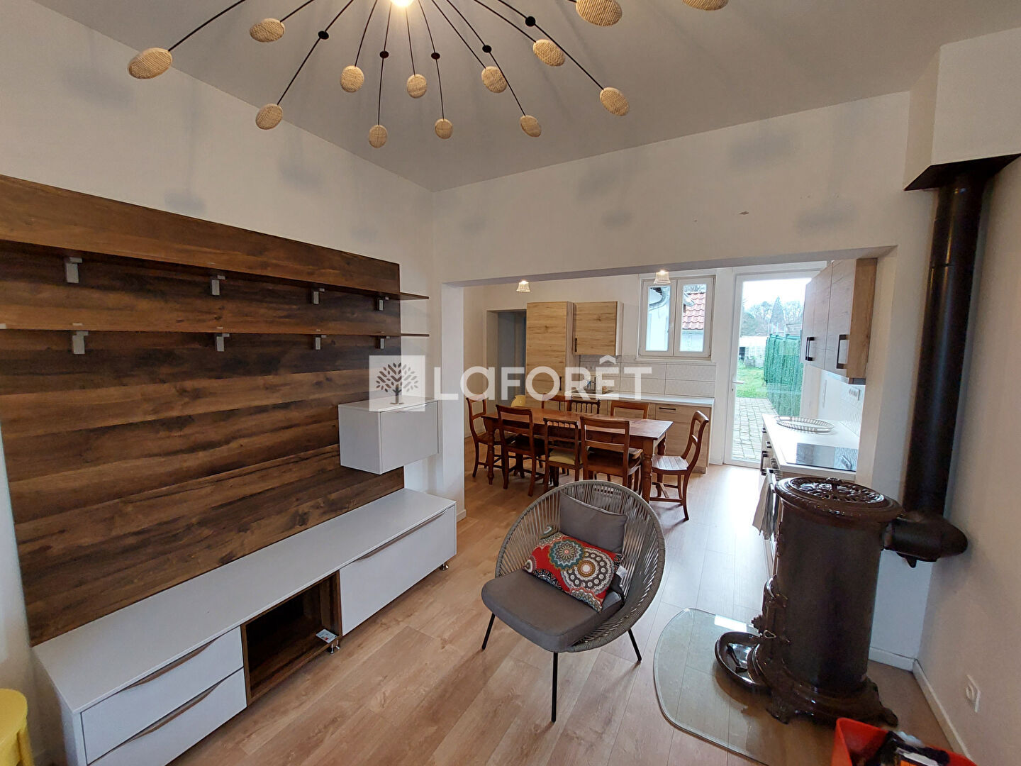 Chauffage : radiateurs électriques et poêle à bois.