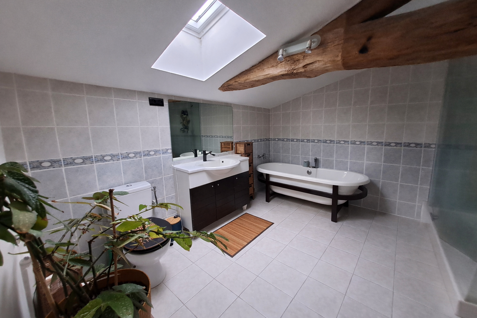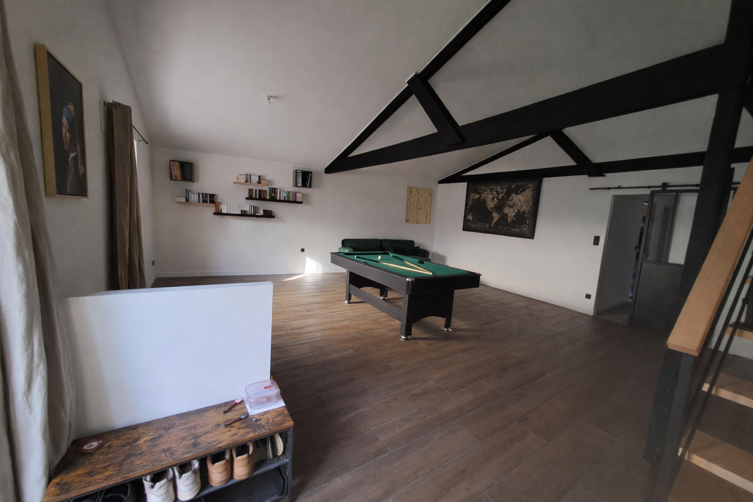 La maison principale se compose au rez-de-chaussée: d'une cuisine équipée séparée, un salon avec cheminée (poêle à bois), une salle de jeux, une salle de sport pouvant servi de chambre, une buanderie, un cellier, un wc ainsi qu'un dégagement.